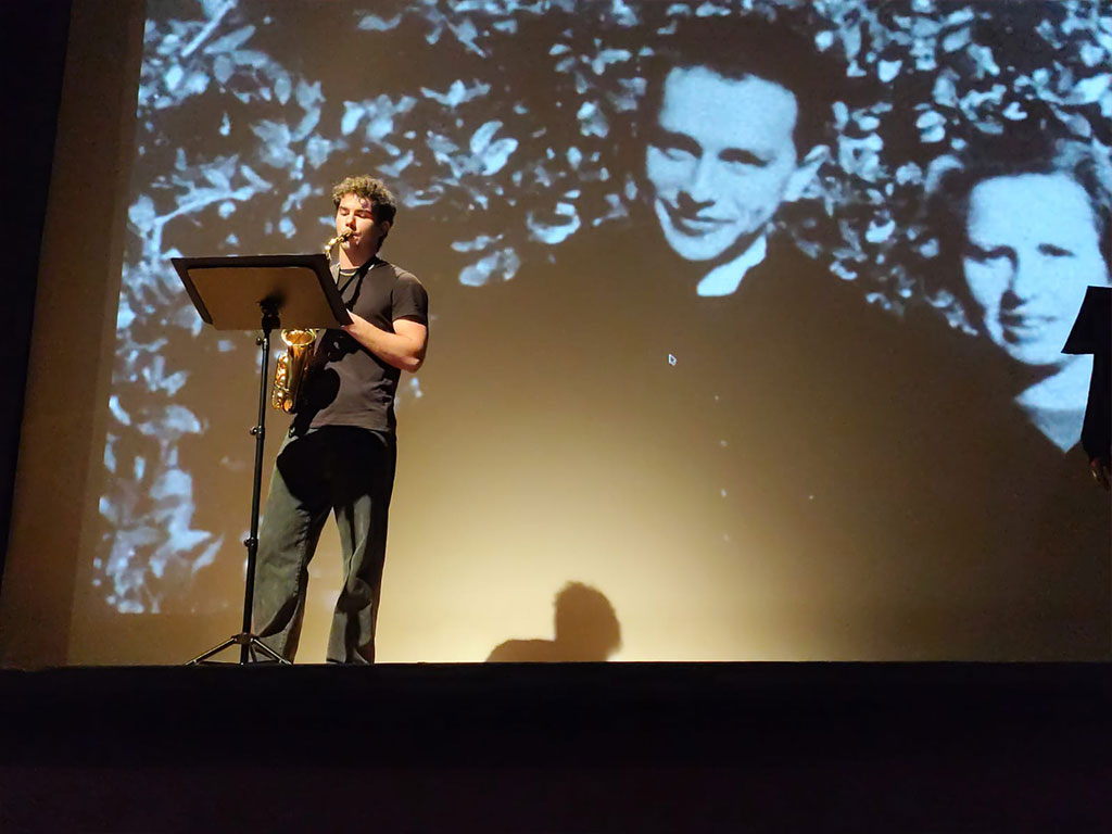 Sul piano musicale, Giovanni Tancredi Tafani ha stupito il pubblico del Teatro con esibizioni e improvvisazioni al sax, rielaborando con grande sensibilità temi celebri come Schindler’s List, Imagine e Love Story, creando un dialogo emotivo tra memoria, speranza e contemporaneità.