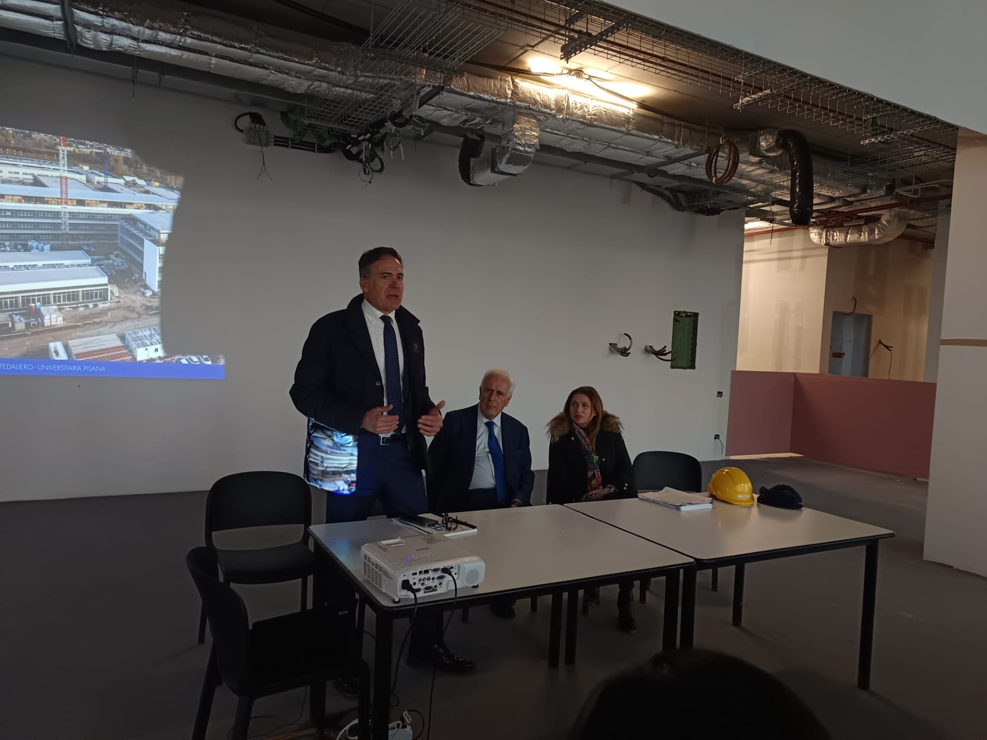 Durante la visita hanno verificato come - dopo il completamento a maggio scorso della Centrale tecnologica CT0 (da 70 milioni di euro), che sarà operativa dal prossimo aprile - anche la mensa aziendale sia sostanzialmente pronta per le attrezzature e gli arredi e stiano prendendo forma l’arteria principale interna di raccordo (main street) del nuovo ingresso con tutti gli altri edifici. I primi che saranno completati sono la palazzina degli uffici amministrativi e del Centro direzionale (Ed. 50) e il nuovo stabile (Unipi 1), che accoglierà le funzioni didattiche dell’Università di Pisa attualmente alla Scuola medica di via Roma (entro il 2026). Dopodiché si procederà con l’immobile che ospiterà il Dipartimento materno-infantile (Ed. 33) fino alla realizzazione (entro il 2027) delle aree a maggiore complessità destinate alle degenze e ai blocchi operatori (Ed. 34).
