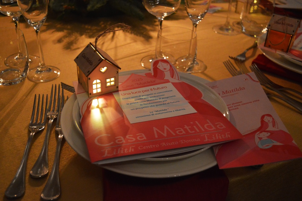 Il progetto Casa Matilda nasce undici anni fa ed è il frutto concreto della solidarietà di imprenditori, associazioni e cittadini. Rivolta a donne e minori vittime di violenza, la struttura, gestita dal Centro Aiuto Donna Lilith, opera nella delicata fase successiva all’emergenza, offrendo accoglienza e accompagnamento nella costruzione di un progetto individualizzato di autonomia: un percorso che significa lavoro, casa, serenità e soprattutto libertà. Un simbolo tangibile di questo cammino era presente su ogni tavolo della cena: una piccola casetta tridimensionale, con una luce all’interno, pensata come ricordo di un gesto concreto da appendere all’albero di Natale. Un oggetto semplice ma fortemente evocativo, capace di raccontare visivamente il senso di Casa Matilda come luogo sicuro, acceso di speranza, in cui ricostruire il proprio futuro.