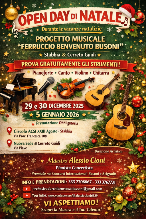 Gli Open Day si svolgeranno il 29 e 30 dicembre 2025 e il 5 gennaio 2026 presso le sedi del Circolo ACSI XXIII Agosto di Stabbia (Via Provinciale Francesca 108) e della nuova sede di Cerreto Guidi (via Piave). Durante queste giornate, i docenti di pianoforte, canto, violino e chitarra saranno a completa disposizione per incontrare gli interessati, offrendo la possibilità di provare gratuitamente gli strumenti e di conoscere i percorsi formativi proposti.