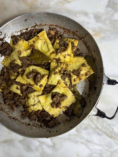 Cuoci i ravioli in abbondante acqua salata (2–3 minuti). Scolali delicatamente. Saltali nel sugo al cinghiale.