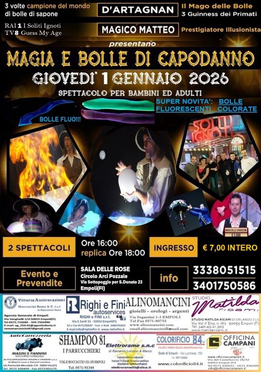 D’Artagnan, Il Mago delle Bolle, artista empolese e detentore di tre Guinness dei Primati, sarà protagonista dello spettacolo “Magia, Bolle e Fuoco di Capodanno”, in programma mercoledì 1 gennaio 2025 alle ore 16 presso la Sala delle Rose del Circolo Arci Pozzale, a Empoli.