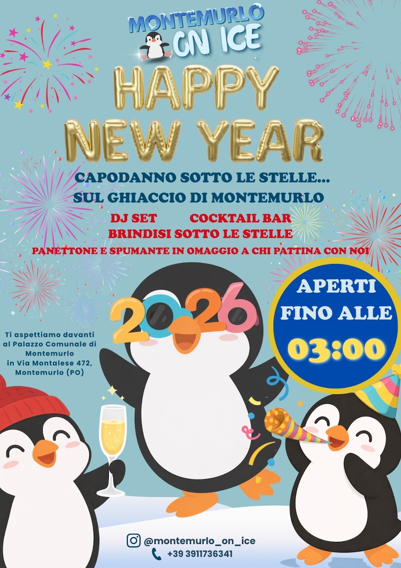 A pochi passi dal teatro, in piazza della Repubblica, davanti al municipio, il villaggio di Natale propone una notte di San Silvestro insieme sotto le stelle. La pista di pattinaggio sul ghiaccio rimarrà aperta in via straordinaria fino alle ore 3 di notte e si potrà ballare e divertirsi grazie al dj set e il cocktail bar. A mezzanotte si brinderà e, a chi pattinerà, sarà offerto panettone e spumante. Per maggiori informazioni Instagram @montemurlo_on_ice telefono 3911736341