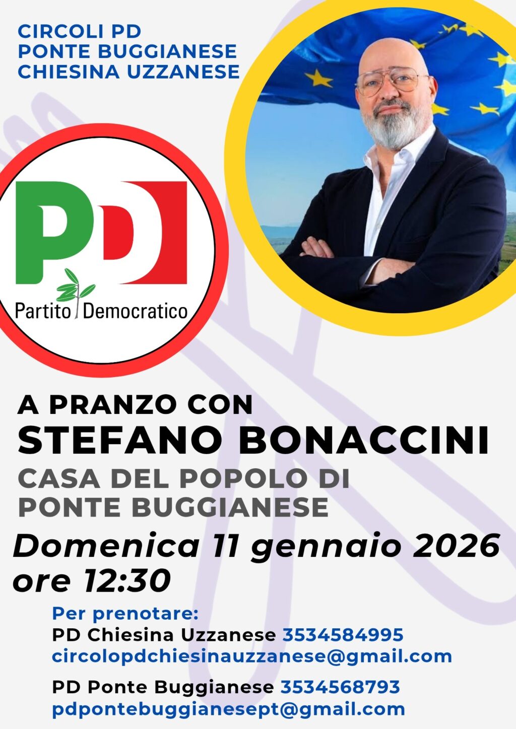 I circoli del Partito Democratico di Chiesina Uzzanese e di Ponte Buggianese iniziano l'anno con un pranzo insieme a Stefano Bonaccini, parlamentare europeo componente delle commissioni l'agricoltura e sviluppo rurale e di quella per il commercio internazionale e presidente dell'assemblea nazionale PD.