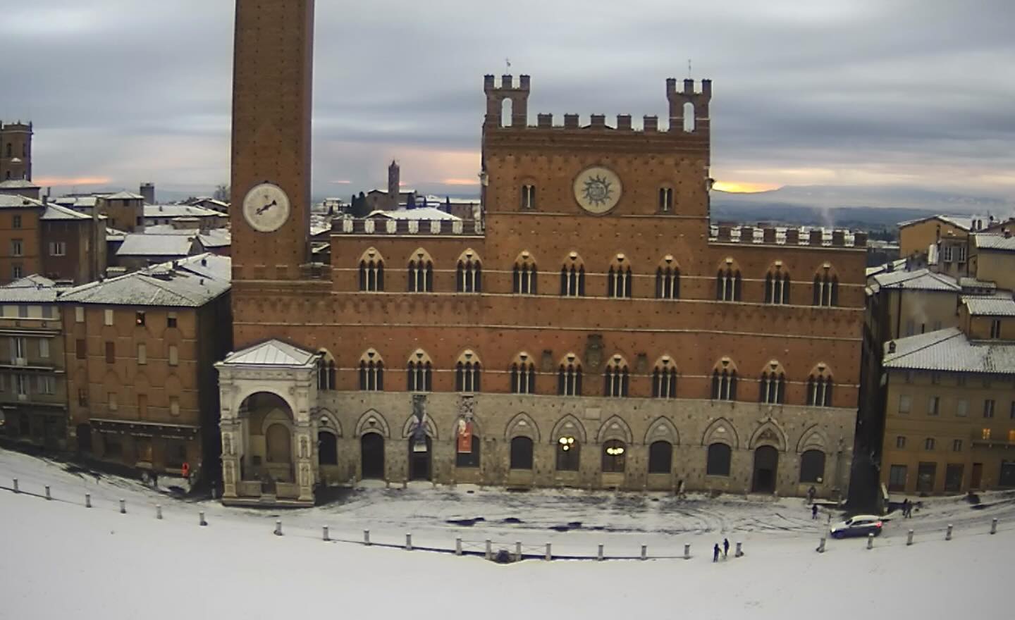 Siena si è imbiancata. La neve, inaspettata, ha colpito la città del Palio poco prima dell'alba di oggi, giovedì 8 gennaio. I tetti e le strade si sono ricoperti da un manto bianco, poi si è formato del ghiaccio. Per questo motivo per oggi il Comune ha disposto che "sono chiuse le scuole di ogni ordine e grado sul territorio comunale".