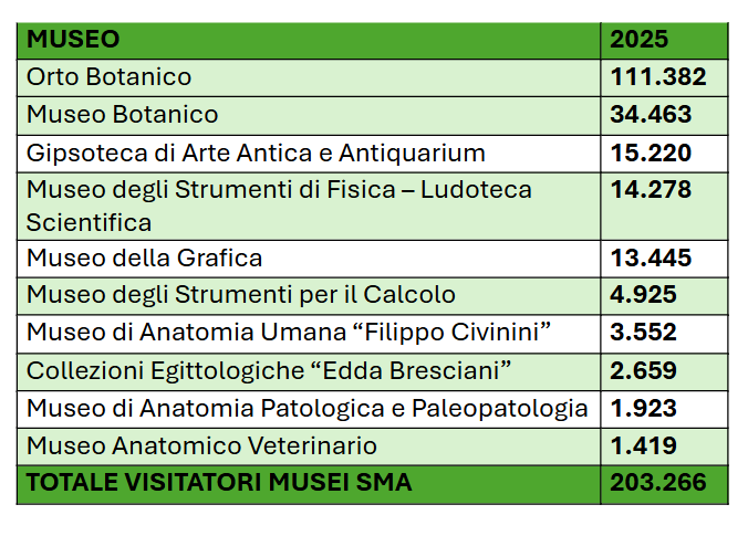Il Sistema Museale di Ateneo ha concluso il 2025 con un numero complessivo di oltre 200.000 visitatori, in netto aumento rispetto al 2024, confermando la tendenza di crescita in tutte le attività museali.