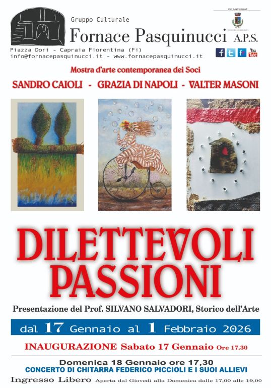Sabato 17 gennaio alle ore 17.30 ci sarà l'Inaugurazione della Mostra d’arte contemporanea 'Dilettevoli passioni' presso i locali della Ex Fornace Pasquinucci, Piazza Dori, Capraia Fiorentina.