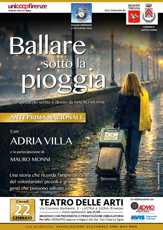 “Ballare sotto la pioggia”, prodotto da Associazione Culturale Sine Qua Non, è un monologo teatrale realizzato con il patrocinio di Avis Toscana e Admo Toscana e sostenuto da Unicoop Firenze. Lo spettacolo è scritto e diretto da Mauro Monni con la partecipazione in scena di Adria Villa, Mauro Monni e Irene Fontanelli della scuola di danza Md academy di Katia Mancini. Sarà in scena il 22 gennaio alle ore 21.00 al Teatro delle Arti di Lastra a Signa.