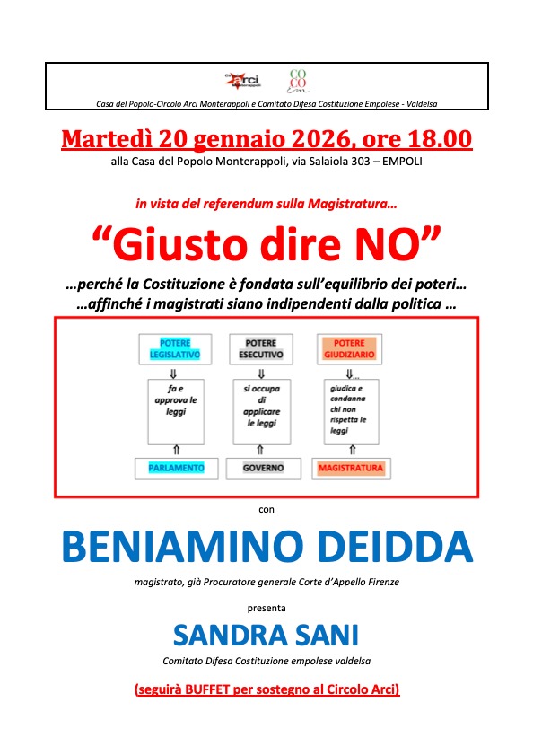 Il primo appuntamento si terrà martedì 20 gennaio alle ore 18 presso la Casa del Popolo di Monterappoli, in via Salaiola 303, Empoli. L'incontro vedrà la partecipazione di Beniamino Deidda, magistrato ed ex Procuratore generale presso la Corte d'Appello di Firenze, che interverrà sul tema della riforma e sull'importanza dell'equilibrio dei poteri sancito dalla Carta costituzionale.