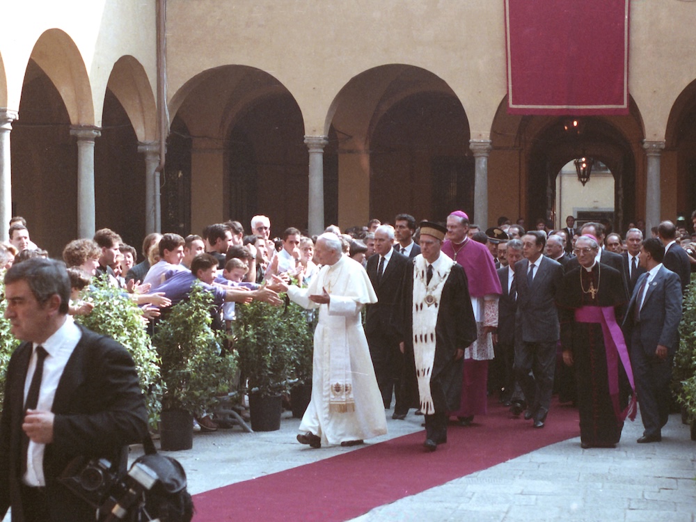 In visita a Pisa nel settembre del 1989, papa Giovanni Paolo II (1920-2005) visitò anche le sedi universitarie. Qui è ritratto nel cortile del Palazzo della Sapienza in compagnia, tra gli altri, dell’allora rettore, lo studioso di ingegneria nucleare Bruno Guerrini (1930-2011). Archivio Frassi, Fondazione Pisa
