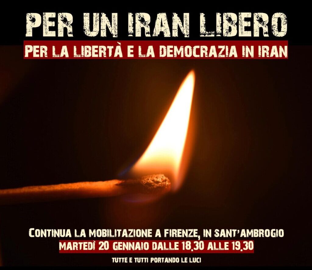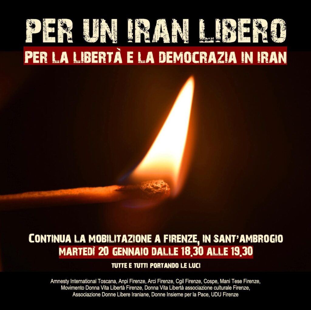 "PER UN IRAN LIBERO. Per la libertà e la democrazia in Iran. Con il popolo iraniano, iIlluminiamo chi resiste, non si piega, rischia tutto per i diritti, la libertà, la giustizia, la democrazia contro il regime. Fughiamo l’ombra della guerra. Fermiamo la feroce repressione che uccide, arresta, condanna alla pena capitale, isola il paese bloccando internet. Sosteniamo la mobilitazione di popolo, nonviolenta, in continuità con il movimento Donna Vita Libertà. Il futuro dell’Iran appartiene solo al suo popolo. Donna, Vita e Libertà è il nostro grido", così in una nota firmata da tutti i soggetti proponenti.