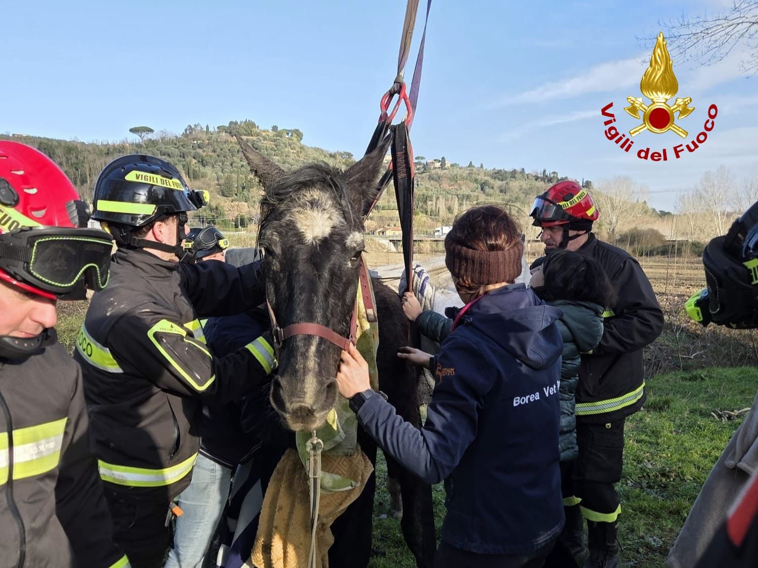Due squadre dei vigili del fuoco di Pisa sono intervenute alle ore 13:30 sulla Strada Comunale Pian del Roglio a Capannoli per soccorso a un animale. Un cavallo di 37 anni con un peso di 300 chili è caduto in un torrente con 30 cm di acqua.