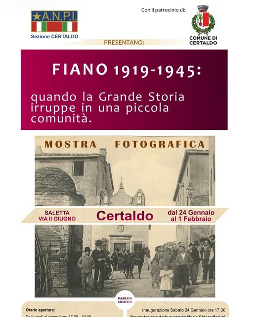 ’ANPI di Certaldo, con il patrocinio del Comune di Certaldo, ripropone la mostra fotografica “Fiano 1919-1945. Quando la Grande Storia irruppe in una piccola comunità”, un’esposizione che raccoglie un’importante selezione di documenti e immagini d’epoca legate alla storia del nostro territorio.
