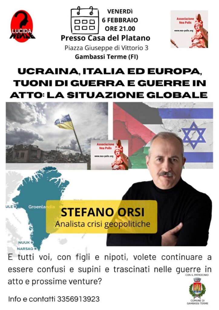 Venerdì 6 febbraio alle ore 21, presso la 'Casa del Platano' (ex teatro) di Gambassi, si terrà un incontro con Stefano Orsi, analista molto attivo sul web, noto per le sue approfondite analisi su crisi internazionali, scenari bellici, rivoluzioni e colpi di stato.