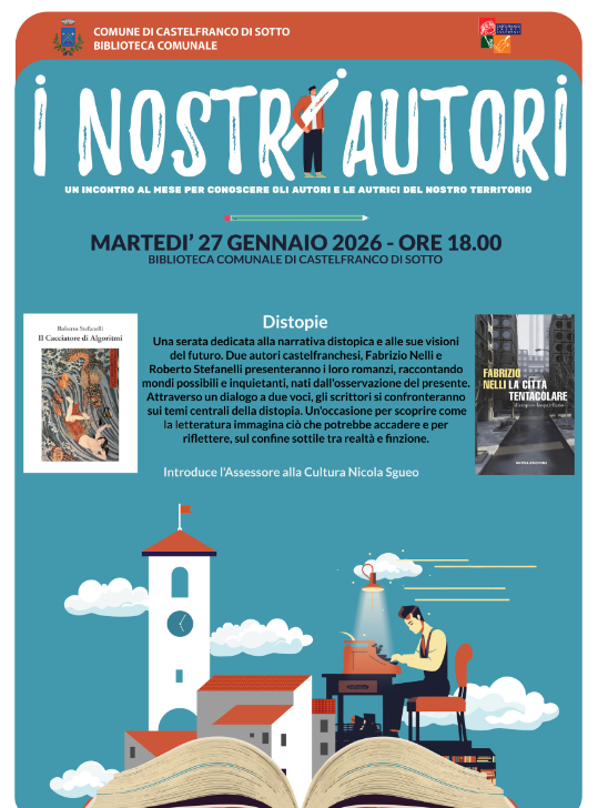 La serata vedrà protagonista un duo di autori locali, entrambi castelfranchesi, Roberto Stefanelli e Fabrizio Nelli, che presenteranno le loro opere recenti: Il cacciatore di algoritmi e La città tentacolare, due romanzi che, pur partendo da universi narrativi differenti, condividono la capacità di riflettere criticamente sul presente tramite la lente immaginifica della distopia, cioè la narrazione di una società futura o immaginaria indesiderabile, spaventosa e oppressiva.