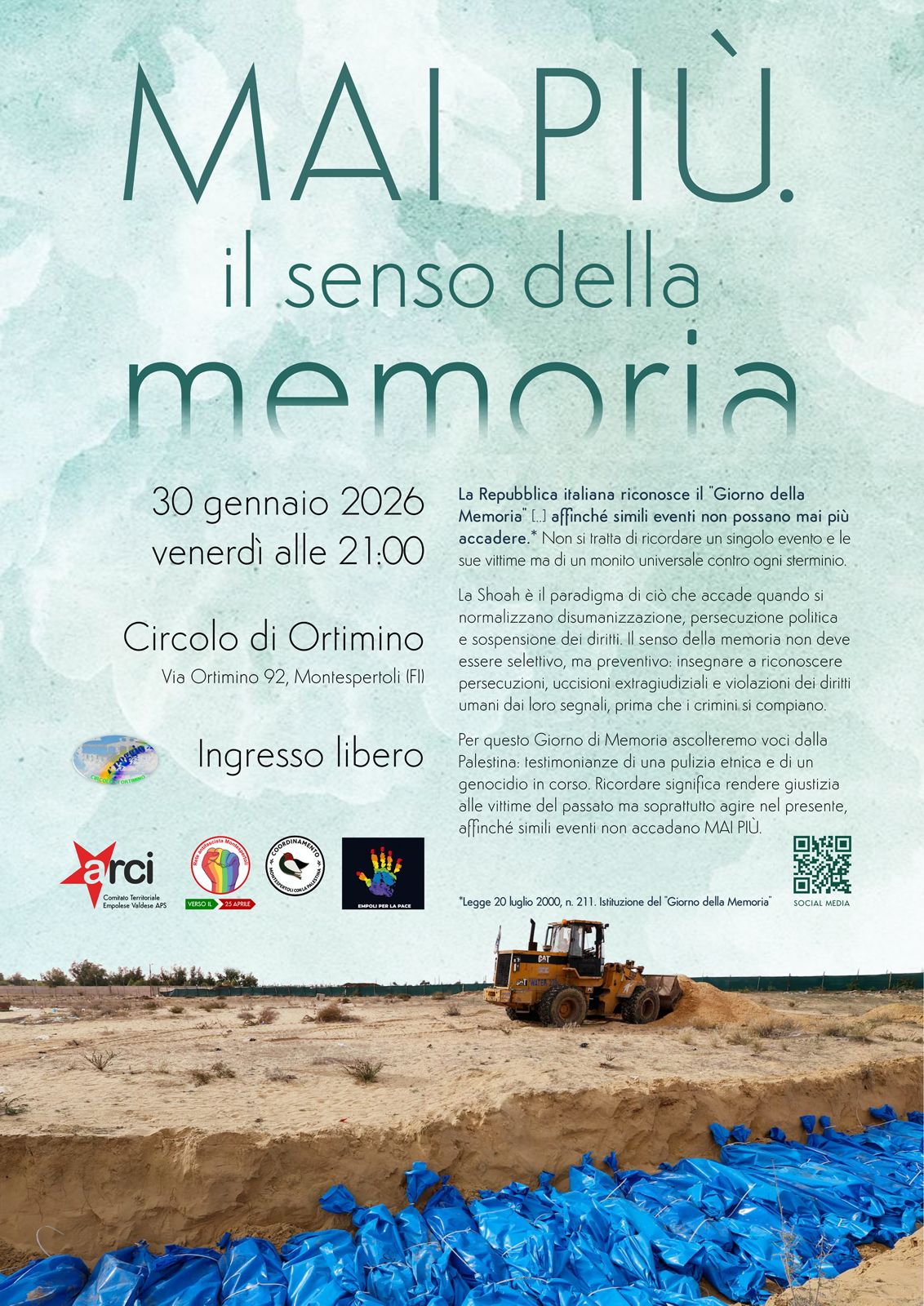 È a partire da questo significato che il Coordinamento di Montespertoli con la Palestina e la Rete Antifascista di Montespertoli vogliono esprimere un forte “Mai più, per nessuno”. Per evitare che la memoria si trasformi in una pratica selettiva, incapace di riconoscere la sofferenza quando colpisce altri popoli.