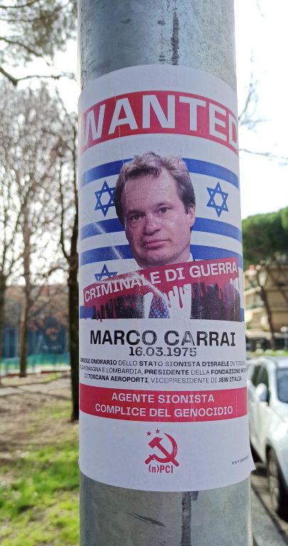 Un manifesto antisemita contro Marco Carrai, console onorario di Israele, è comparso oggi a Sesto Fiorentino. La notizia è stata diffusa dal consigliere regionale Marco Stella, che denuncia l'accaduto ed esprime piena solidarietà all'imprenditore toscano, recentemente dimessosi dalla presidenza della Fondazione Meyer dopo anni di proteste per il suo coinvolgimento con Israele.