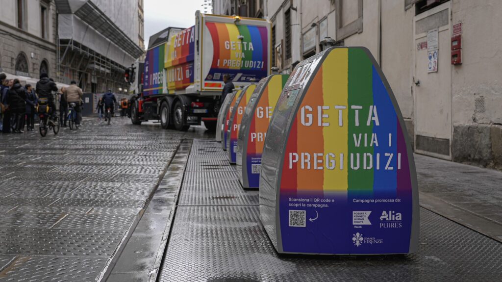 Firenze trasforma lo spazio pubblico in un messaggio di diritti, rispetto e responsabilità collettiva. Postazioni interrate, mezzi di raccolta e cestini di alcuni dei principali quartieri cittadini si vestono della bandiera dei diritti umani con il messaggio “Getta via i pregiudizi”: un invito diretto a liberarsi da stereotipi e discriminazioni, trasformando un gesto quotidiano come il conferimento dei rifiuti in un atto di consapevolezza civile.
