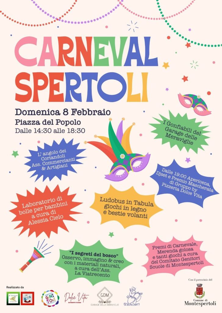 Colori, maschere, giochi e creatività: domenica 8 febbraio torna Carnevalspertoli, il pomeriggio di festa che animerà piazza del Popolo dalle 14:30 alle 18:30, con un ricco programma di attività dedicate a bambini, famiglie e a tutta la comunità.