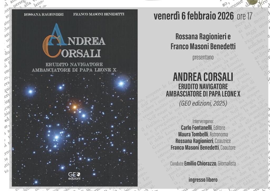 Venerdì 6 febbraio alle 17 la biblioteca 'Renato Fucini' di Empoli ospita l'appuntamento con Empolichescrive: Rossana Ragionieri e Franco Masoni Benedetti presenteranno il libro 'Andrea Corsali. Erudito navigatore ambasciatore di Papa Leone X'. Saranno presenti l'editore Carlo Fontanelli e l'astronoma Maura Tombelli. Conduce il giornalista Emilio Chiorazzo. L'evento è a ingresso libero.