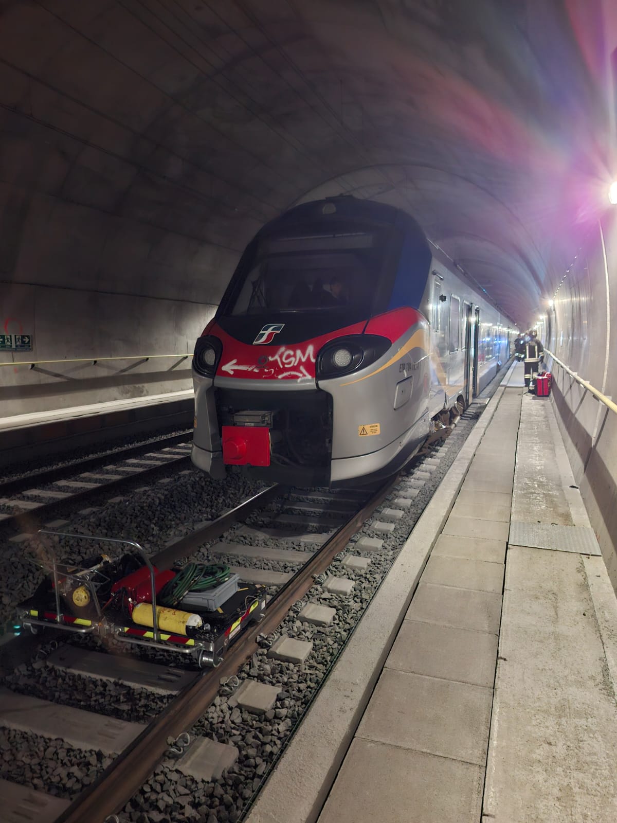 Il personale sanitario è stato accompagnato in galleria dai tecnici di RFI e dai Vigili del Fuoco che, giunti sul posto, hanno prestato soccorso al macchinista, trasferendolo, insieme ai passeggeri del treno, all’esterno della galleria.
