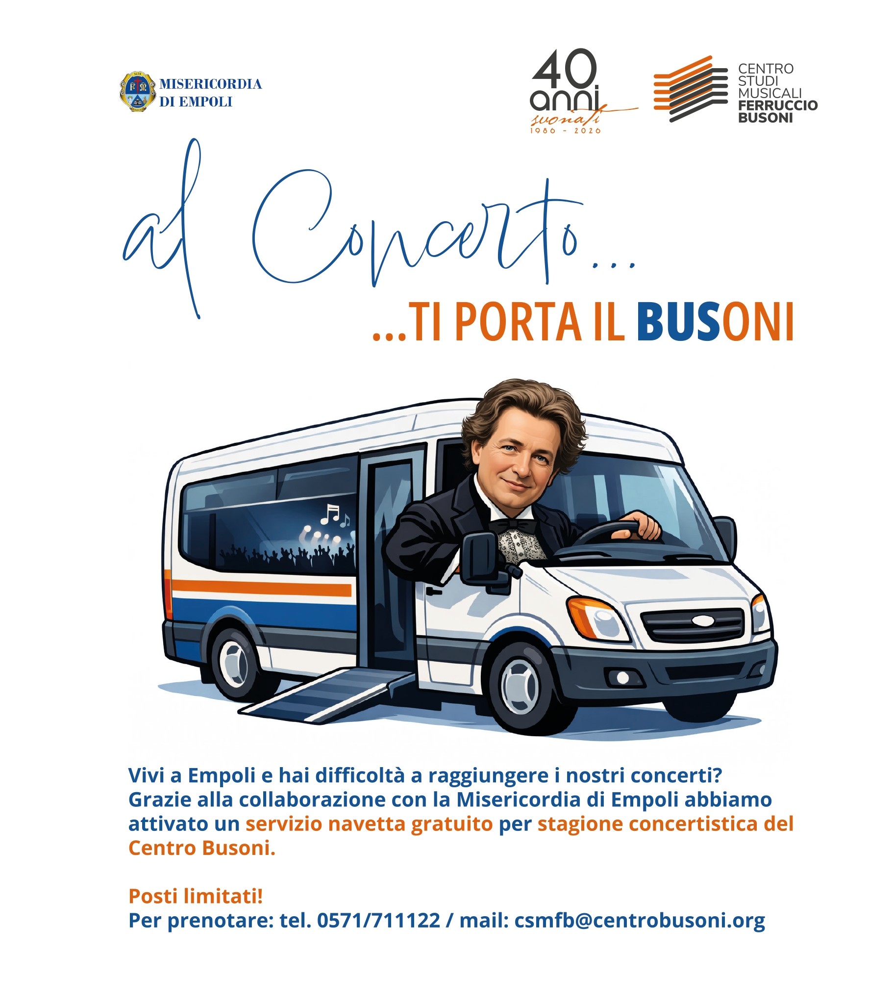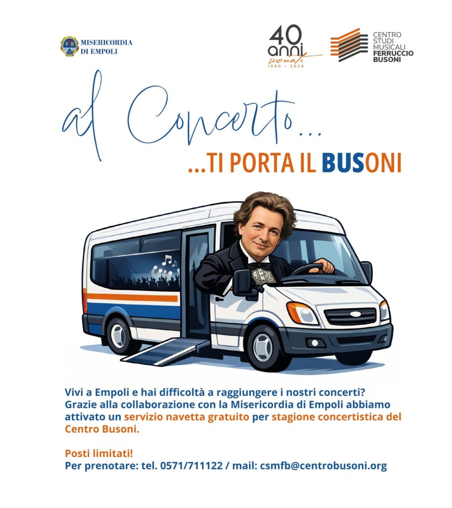Il Centro Studi Musicali Ferruccio Busoni attiva il servizio navetta gratuito per i residenti del comune di Empoli. Raggiungere i concerti del Centro Studi Musicali Ferruccio Busoni diventa ancora più semplice grazie al nuovo servizio “Al concerto ti porta il BUSoni”, attivato in collaborazione con la Misericordia di Empoli.