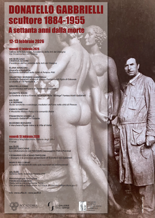 In occasione del settantesimo anniversario dalla morte dello scultore Donatello Gabbrielli (Scandicci 1884-1955), l’Accademia delle Arti del Disegno e Le Gallerie degli Uffizi, promuovono due giornate di studio a cura di Valentino Moradei Gabbrielli, Elena Marconi e Enrico Sartoni che si svolgeranno: giovedì 12 Febbraio 2026 (ore 10:00-12:30 e 15:00-18:00) nel Salone delle Adunanze dell’Accademia delle Arti del Disegno, in Palazzo dei Beccai in via Orsanmichele 4 a Firenze e venerdì 13 Febbraio 2026 (ore 10:30-12:30) nella Biblioteca Magliabechiana, Gallerie degli Uffizi. Obiettivo dell’iniziativa è di riportare l’attenzione del grande pubblico alla scuola scultorea fiorentina, molto attiva tra Otto e Novecento, che raggiunse elevatissimi livelli artistici e tecnici, riscuotendo massima attenzione dalla committenza internazionale. Un nuovo rinascimento popolato di botteghe artistiche, tra le più fortunate delle quali vi fu senza dubbio quella Fantacchiotti-Gabbrielli. I membri della famiglia Fantacchiotti-Gabbrielli furono tutti accademici del Disegno; numerose opere della loro bottega si trovano nelle collezioni delle Gallerie.