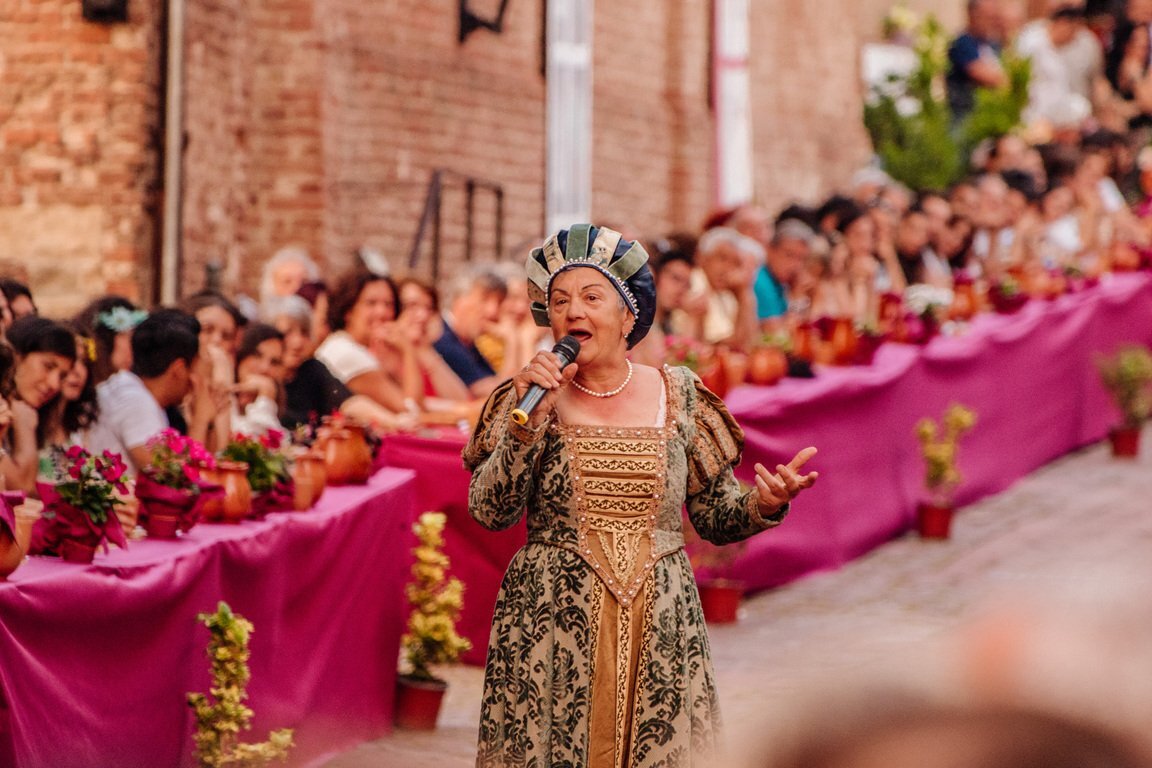 La cena si svolgerà a lume di candela, lungo una lunghissima tavola apparecchiata per tutta via del Castello (via Boccaccio), nel cuore di Certaldo Alto. I partecipanti saranno seduti ai lati della strada, immersi in un’atmosfera scenografica ed emozionante.