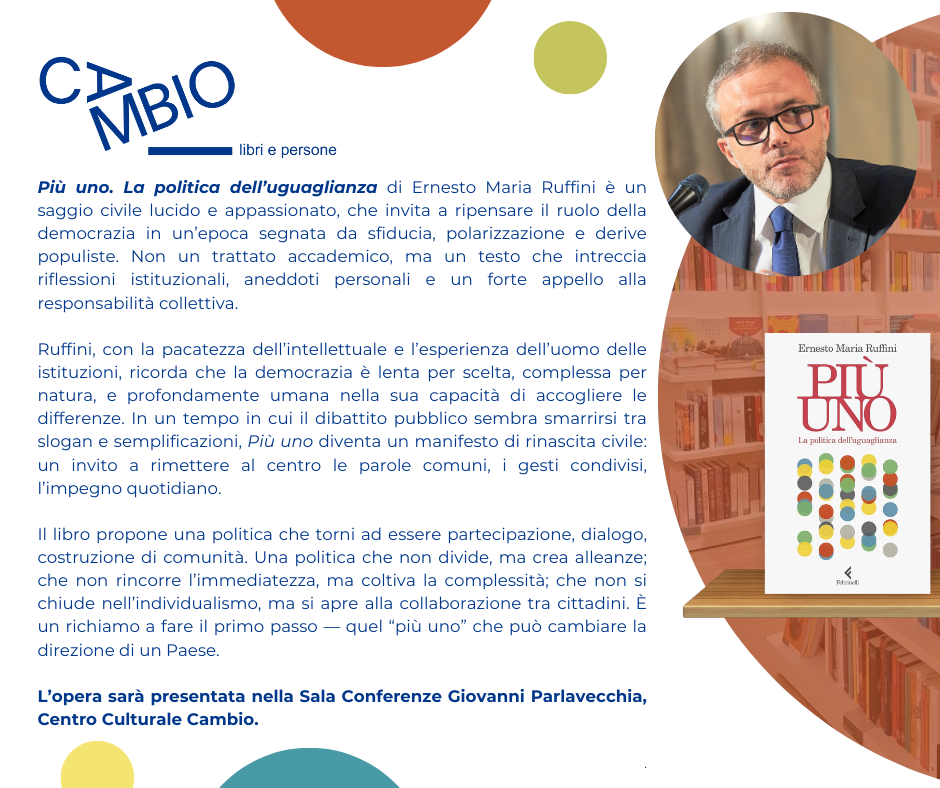Il Centro Culturale Cambio – Libreria Libri&Persone annuncia con piacere la presentazione del saggio Più uno. La politica dell’uguaglianza di Ernesto Maria Ruffini nell'ambito della rubrica Libri d'autore, in programma venerdì 20 febbraio alle ore 18.00 presso la Sala Conferenze Giovanni Parlavecchia del Centro Culturale Cambio, a Castelfiorentino (FI).