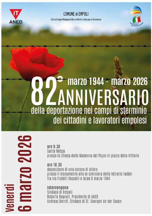 Insieme alla delegazione della cittadina austriaca gemellata con il Comune di Empoli dal 1997, Sankt Georgen an der Gusen, guidata dal suo primo cittadino, il sindaco Andreas Derntl, sarà celebrato l’82° anniversario della deportazione nei campi di sterminio dei cittadini e lavoratori empolesi.