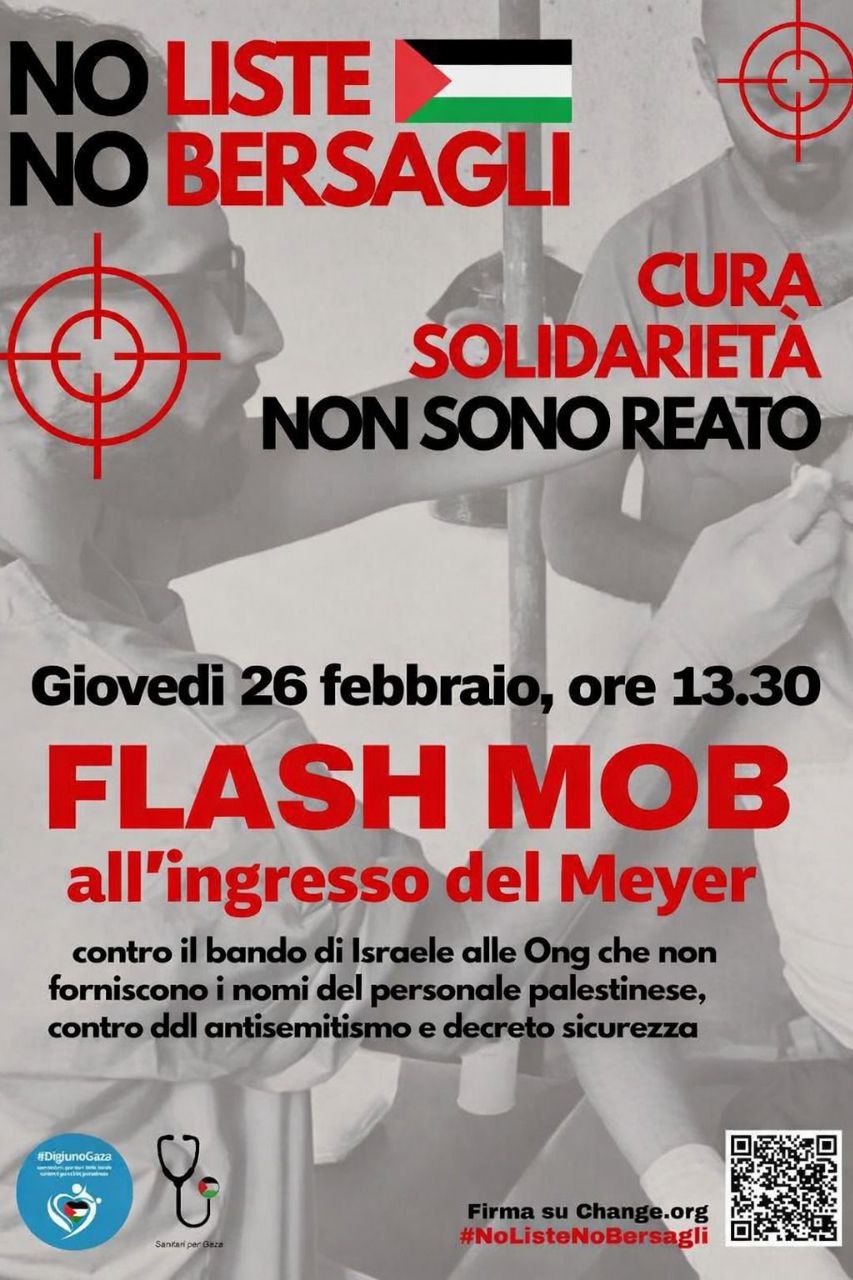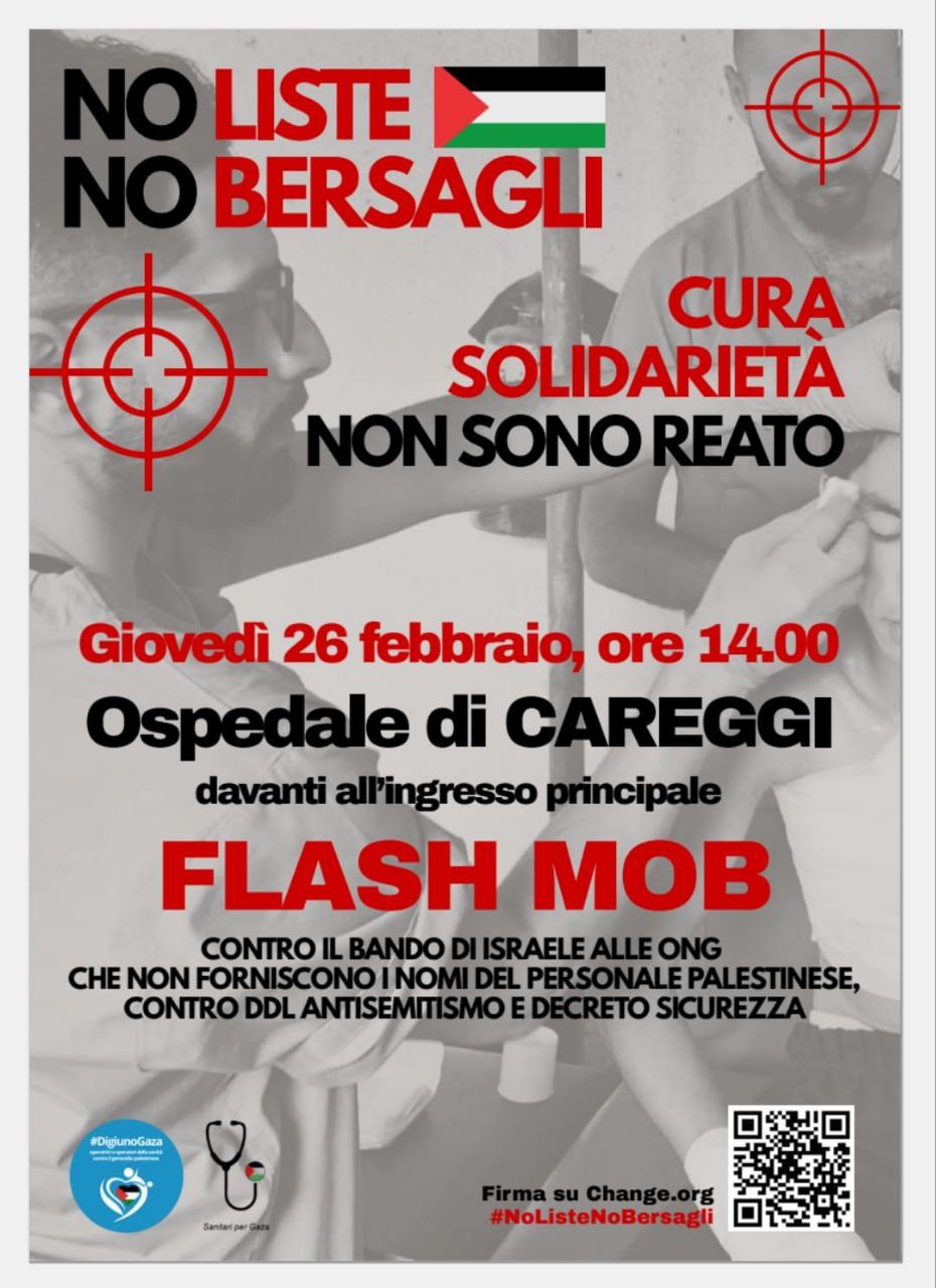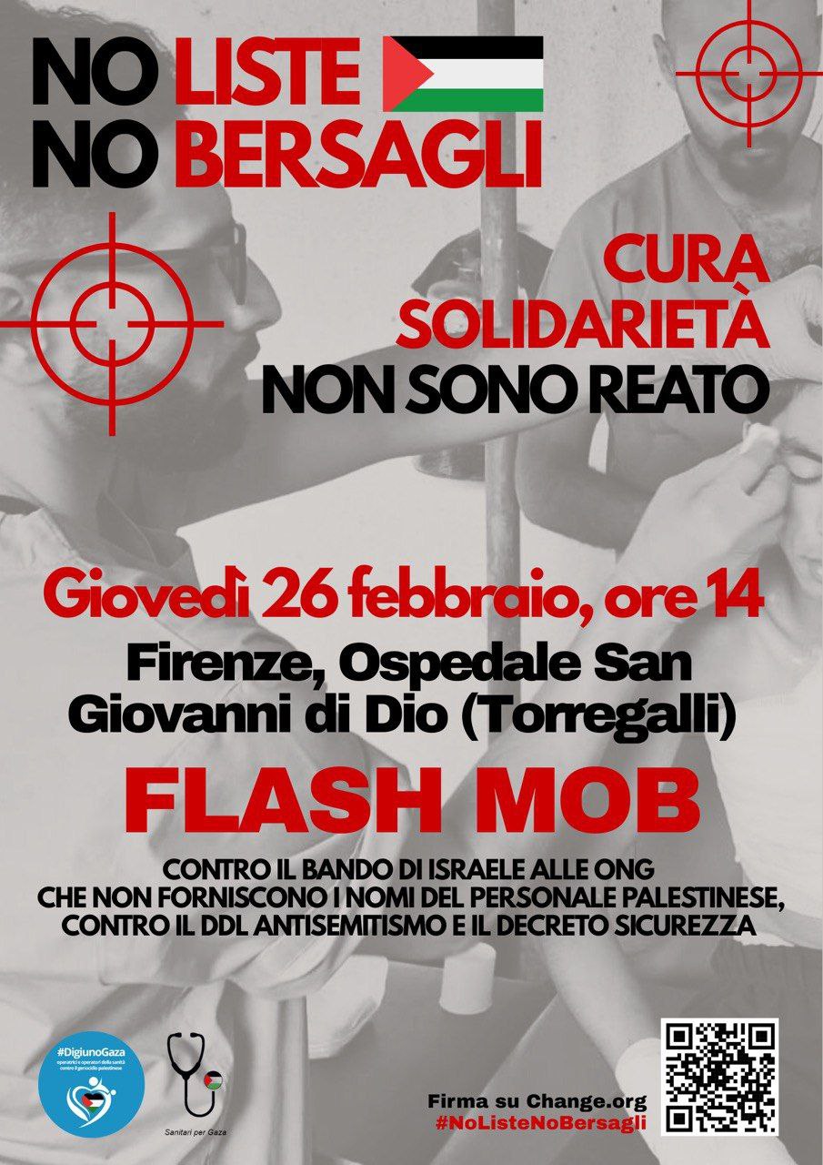 Come reti #DigiunoGaza e Sanitari per Gaza lanciamo per giovedì 26 febbraio tra le ore 13.30 e le 14.30 davanti alle strutture ospedaliere e sanitarie il flash mob “No liste no bersagli. Solidarietà e cura non sono reato”.