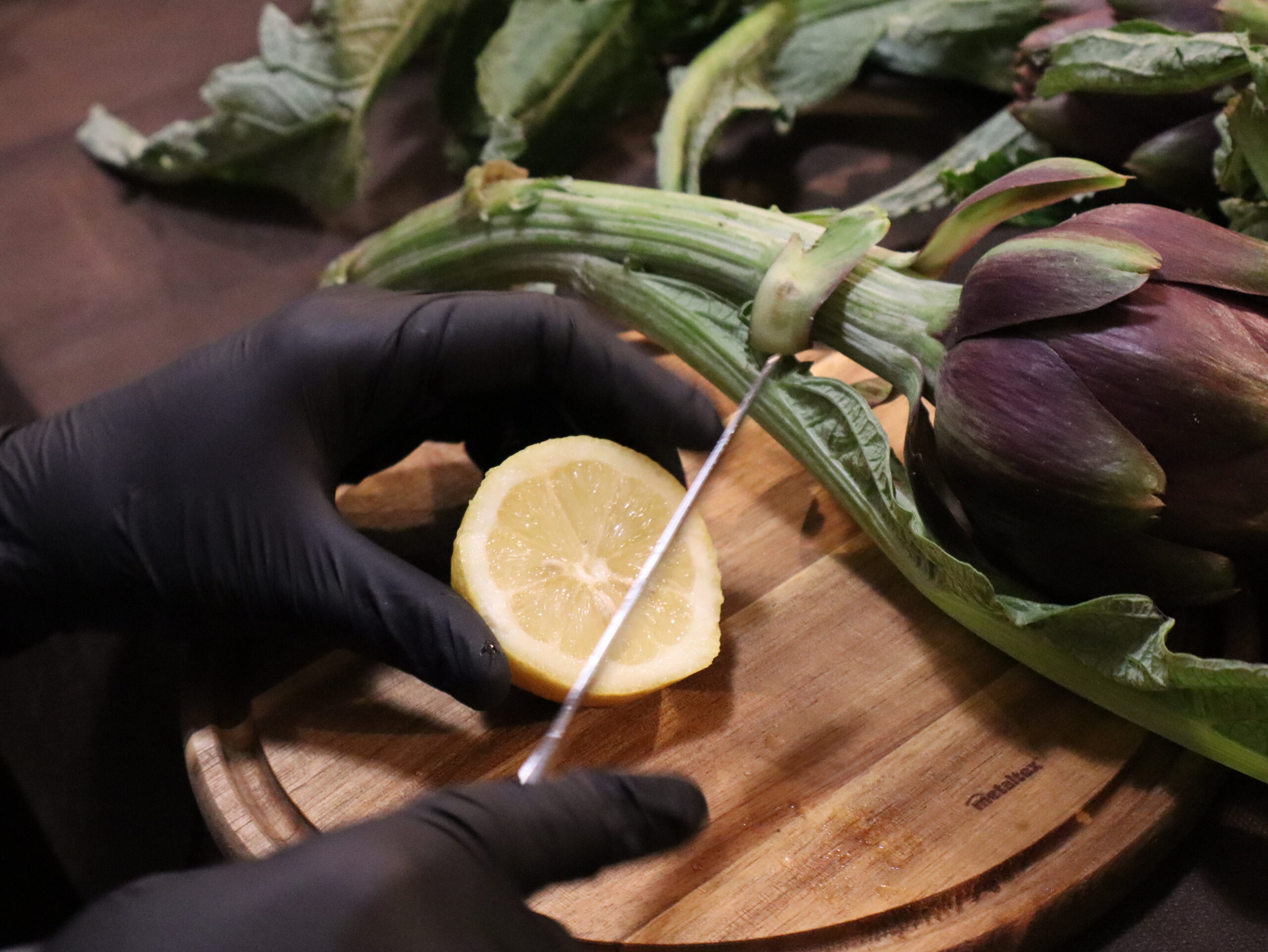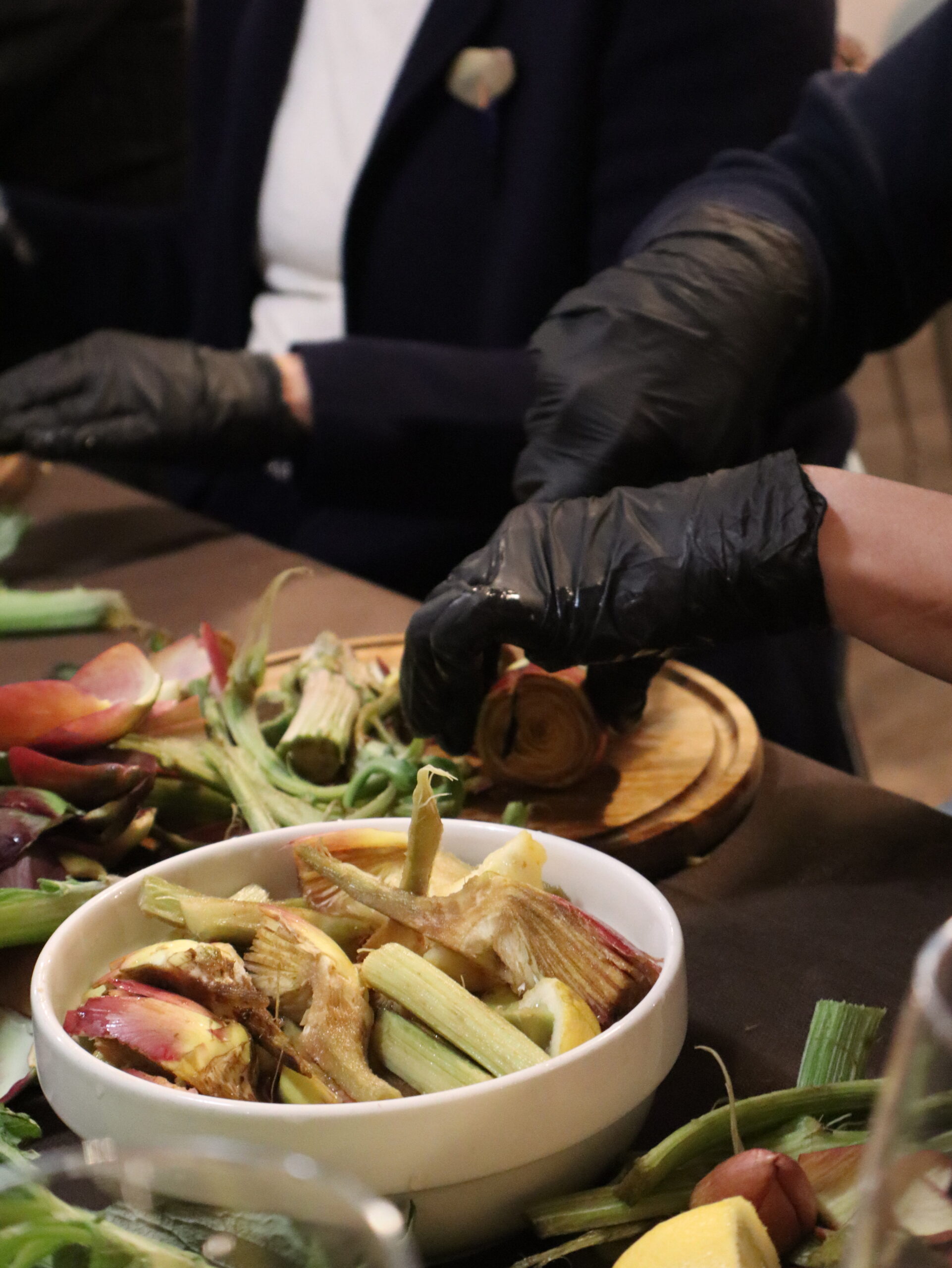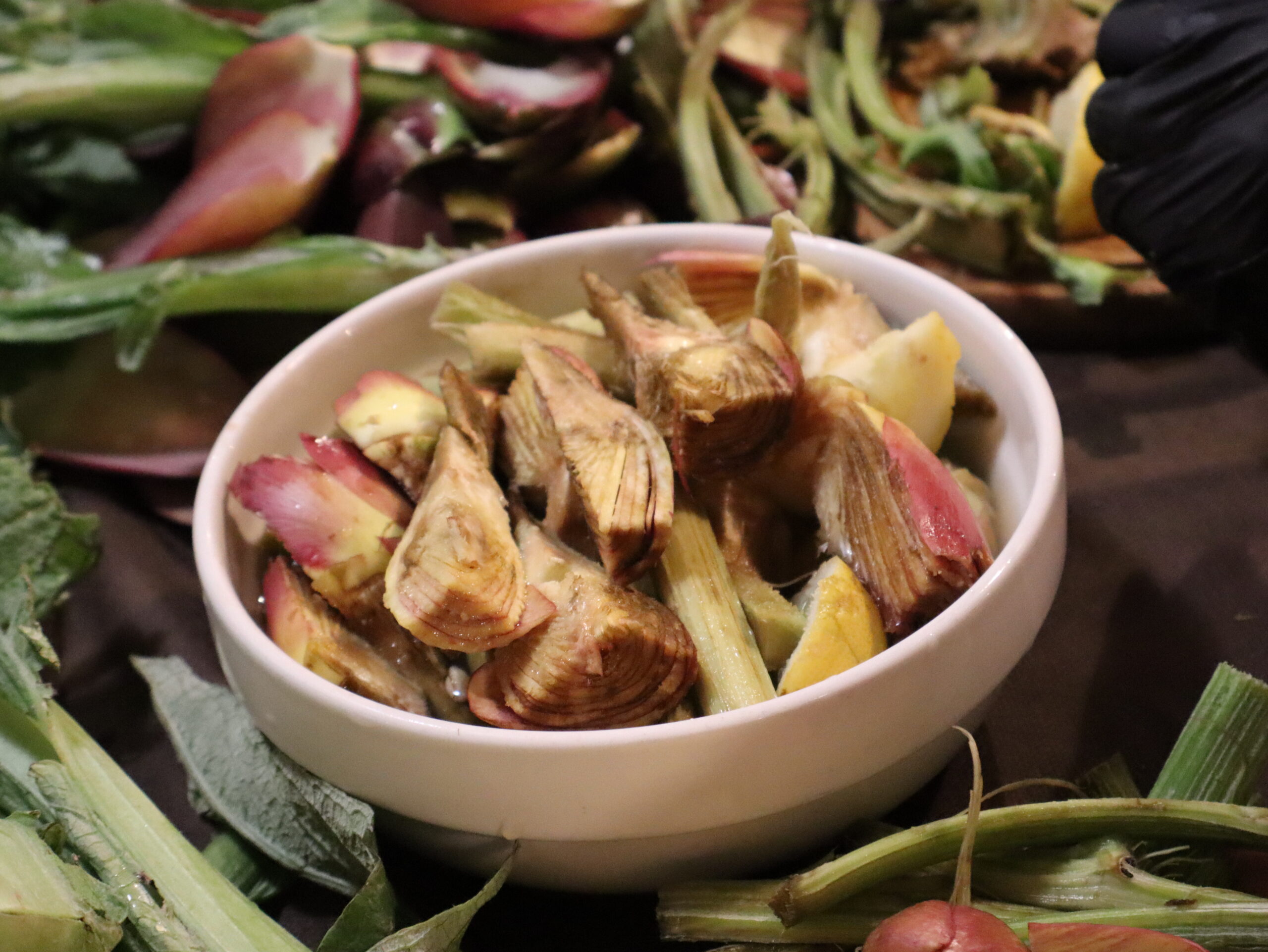 Una serata riservata a istituzioni e stampa, in cui il carciofo è stato il grande protagonista: a cominciare da un educational dedicato a giornalisti ed esperti del settore, durante il quale lo chef ha illustrato le tecniche di pulitura e lavorazione del carciofo, accompagnate da una degustazione guidata dalla giornalista ed esperta di enogastronomia Francesca Pinochi, che ha condotto la serata.