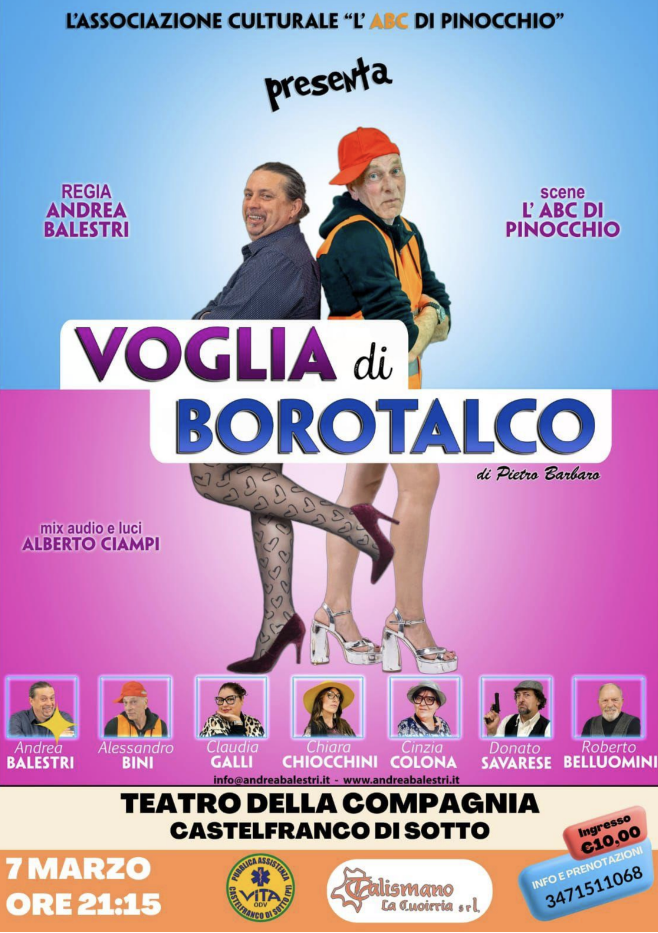 La compagnia teatrale L’ABC di Pinocchio, attiva dal 2011 e composta da un gruppo affiatato di attori amatoriali, torna sul palco con la commedia brillante “Voglia di Borotalco”, in programma sabato 7 Marzo 2026 alle ore 21:15 presso il Teatro della Compagnia di Castelfranco di Sotto (PI).
