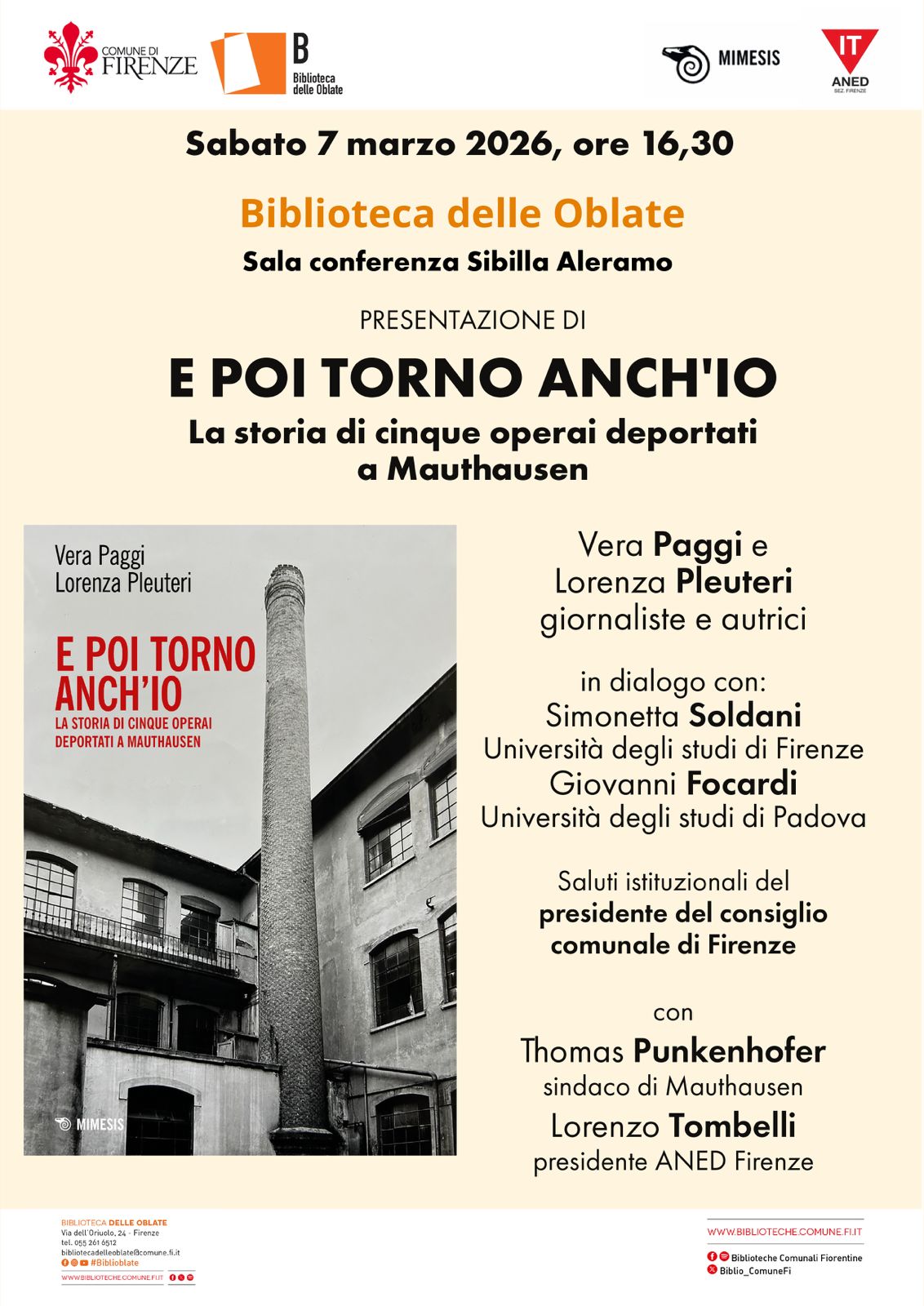 Le commemorazioni si apriranno sabato 7 marzo alle ore 11 con la cerimonia di intitolazione del Giardino Mario Piccioli (accesso da via delle Case Nuove, Firenze). Piccioli, deportato politico a Mauthausen e scomparso quindici anni fa, è stato presidente dell’ANED di Firenze e una figura di riferimento nella trasmissione della memoria della deportazione nel territorio fiorentino. Nel pomeriggio, alle ore 16.30 alla Biblioteca delle Oblate – Sala Sibilla Aleramo, si terrà la presentazione del volume "E poi torno anch’io. La storia di cinque operai deportati a Mauthausen", di Vera Paggi e Lorenza Pleuteri (Mimesis, gennaio 2026). Il libro ricostruisce la vicenda degli operai fiorentini arrestati dopo gli scioperi del marzo 1944 e deportati nel sistema concentrazionario nazista. “La deportazione non fu un evento lontano: partì dalle fabbriche e dalle case della città. Raccontare queste storie significa restituire nomi e volti a una memoria spesso rimasta astratta”, afferma Vera Paggi. Dialogheranno con le autrici gli storici Simonetta Soldani (Università di Firenze) e Giovanni Focardi (Università di Padova). Interverranno inoltre Thomas Punkenhofer, sindaco di Mauthausen, e Lorenzo Tombelli, presidente ANED Firenze.