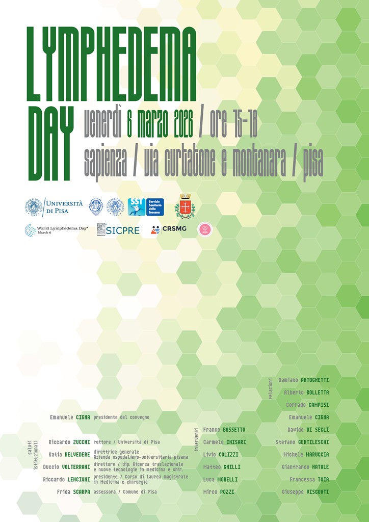 Venerdì 6 marzo, dalle 15 alle 18, l'aula magna storica della Sapienza (via Curtatone e Montanara, Pisa) ospiterà il convegno "Lymphedema Day", organizzato in occasione della Giornata Mondiale del Linfedema (World Lymphedema Day), che si celebra da undici anni in tutto il mondo.