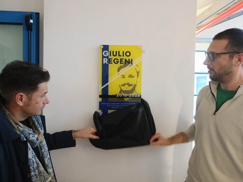 È stata scoperta ieri, al primo piano della biblioteca Gronchi, una targa che ricorda Giulio Regeni a dieci anni dalla sua scomparsa. E' raffigurata l'immagine del ricercatore universitario rapito, torturato ed ucciso in Egitto all'inizio del 2016.