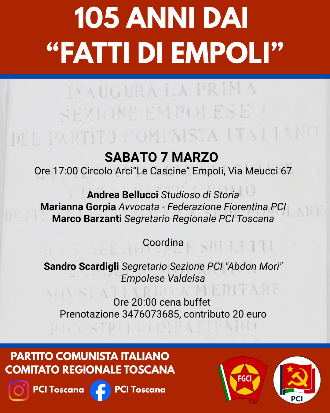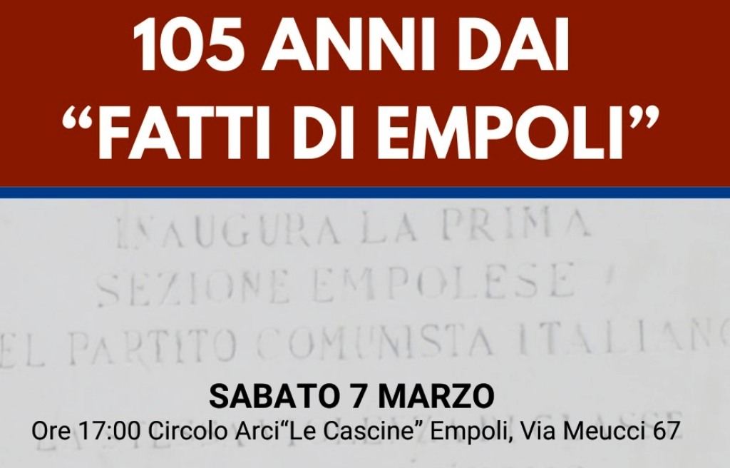Sabato 7 marzo alle ore 17.00, presso il Circolo ARCI "Le Cascine" di Empoli, si terrà un incontro-dibattito organizzato dal Comitato Regionale della Toscana del Partito Comunista Italiano, dal titolo: "A 105 anni dai Fatti di Empoli".