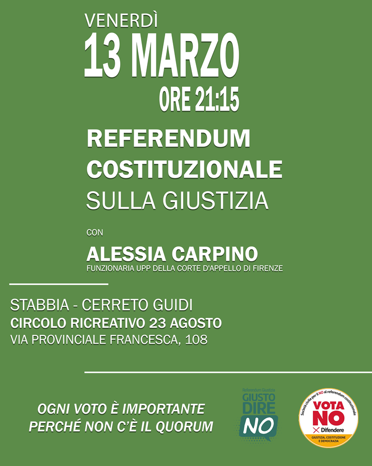 Venerdì 13 Marzo, alle ore 21, il Comitato empolese della Società Civile per il NO, farà tappa al Circolo Ricreativo 23 Agosto di Stabbia, Cerreto Guidi.