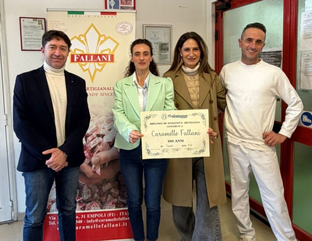 Un secolo di storia imprenditoriale, tradizione artigiana e capacità di innovare mantenendo salde le proprie radici. Confartigianato Imprese Firenze ha consegnato la pergamena dei cento anni di attività a Caramelle Fallani, storica azienda oggi con sede a Empoli. La presidente di Confartigianato Imprese Firenze Serena Vavolo e Marco Costoli, presidente dell’Area Empolese, hanno consegnato il riconoscimento a Irene Fallani e Matteo Gigli, che oggi guidano l’impresa.
