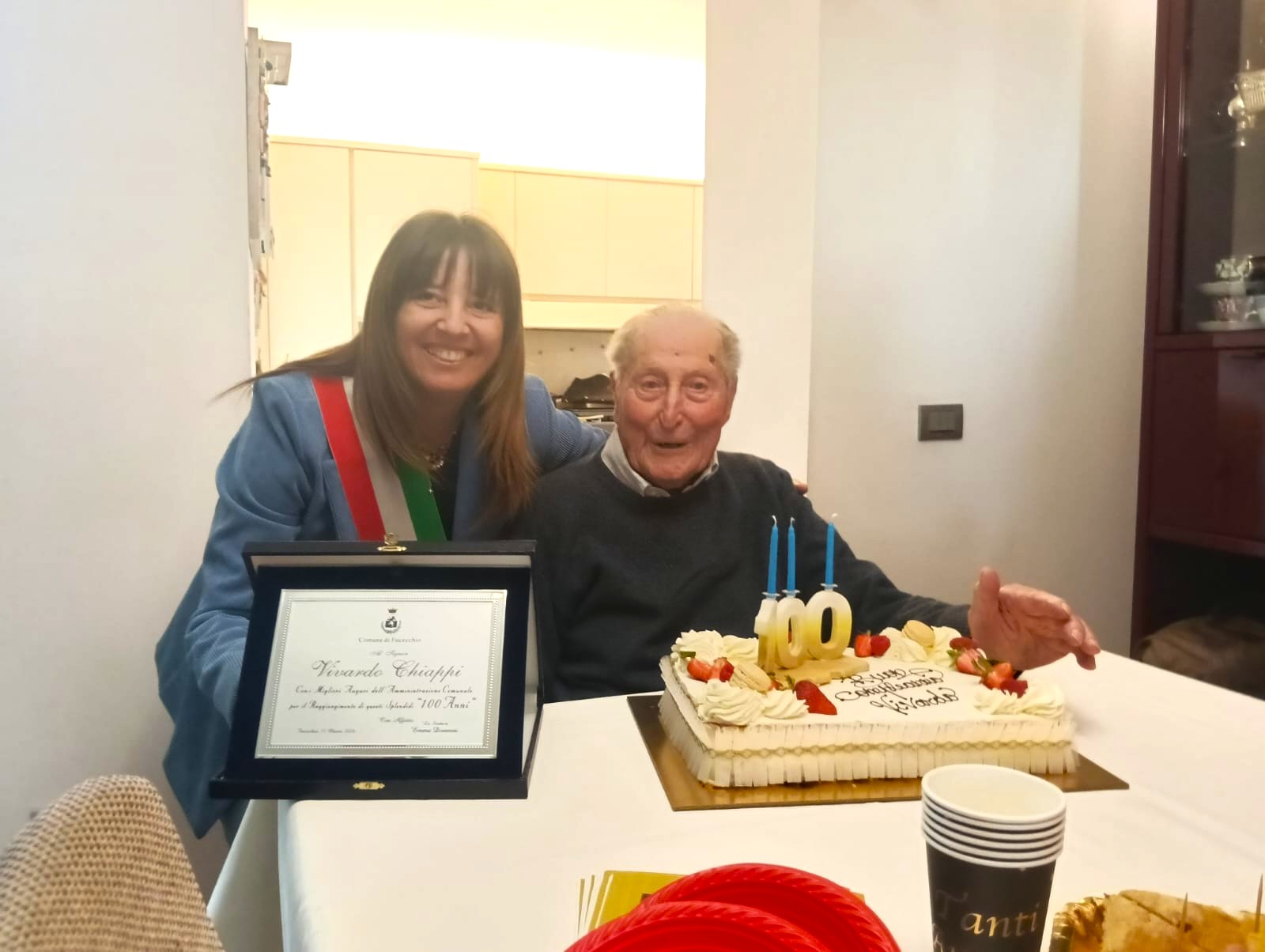 Stamattina (mercoledì 11 marzo 2026) la sindaca di Fucecchio ha voluto omaggiare con una targa ricordo Vivardo Chiappi, che oggi festeggia il prestigioso traguardo del secolo di vita. Al signor Vivardo Chiappi la prima cittadina ha fatto i migliori auguri per questo compleanno speciale a nome di tutta la comunità fucecchiese.
