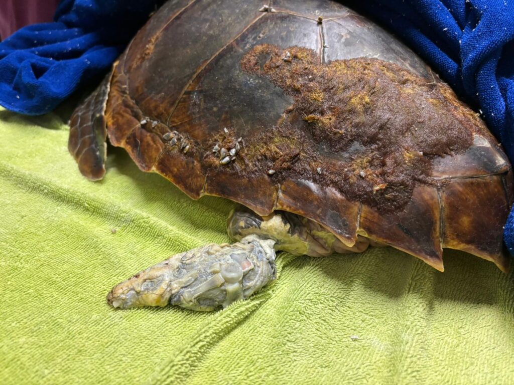 La tartaruga si presentava con due giri di corda stretti attorno alla pinna posteriore sinistra, che sono stati rimossi. Ad una prima osservazione la pinna risultava, purtroppo, irrimediabilmente compromessa, una lenza fuoriusciva dalla bocca e la guancia sinistra presentava una profonda ferita. L’animale risultava inoltre estremamente denutrito e ricoperto di alghe e di parassiti del genere Lepas, tutti segnali che la sua mobilità era ridotta da molto tempo.