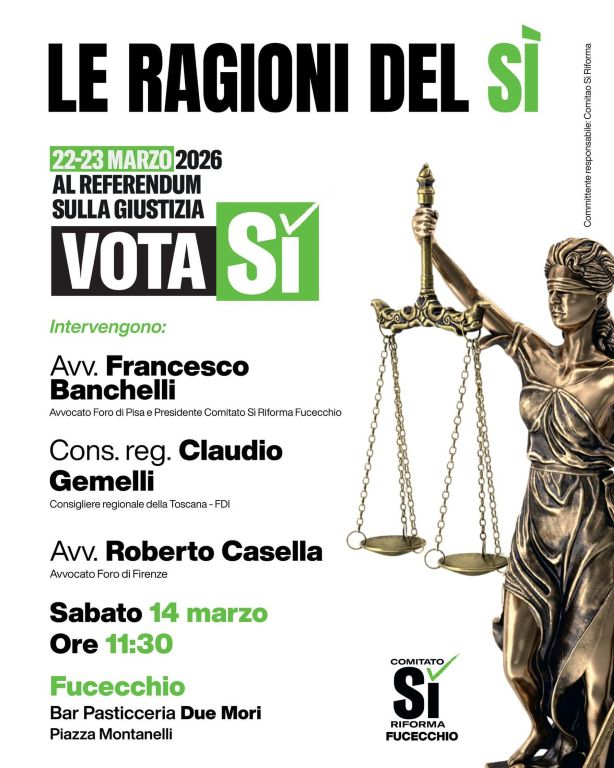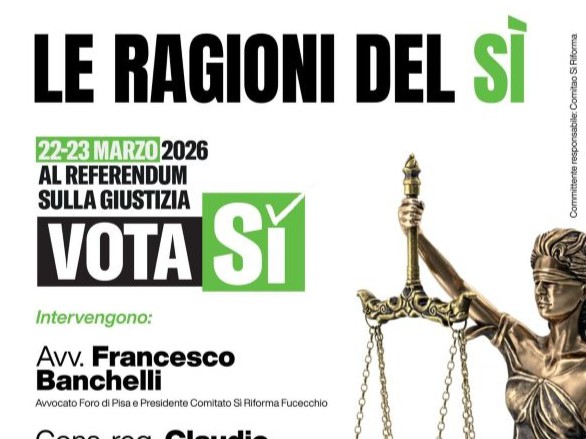 Il Comitato Si Riforma di Fucecchio organizza per questo sabato un incontro informativo per sostenere e condividere con la cittadinanza le ragioni per il SI al referendum dei prossimi 22 e 23 Marzo. L'incontro sarà tenuto e moderato dal Presidente del Comitato locale Avv. Francesco Banchelli del Foro di Pisa insieme a Roberto Casella Avvocato del Foro di Firenze e al Consigliere Regionale Claudio Gemelli.