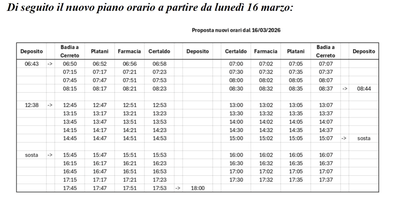 La revisione degli orari nasce dall’ascolto delle esigenze del territorio e dal confronto con cittadini, studenti e pendolari, con l’obiettivo di rendere il servizio sostitutivo più efficiente e vicino ai bisogni di chi ogni giorno utilizza il trasporto pubblico.