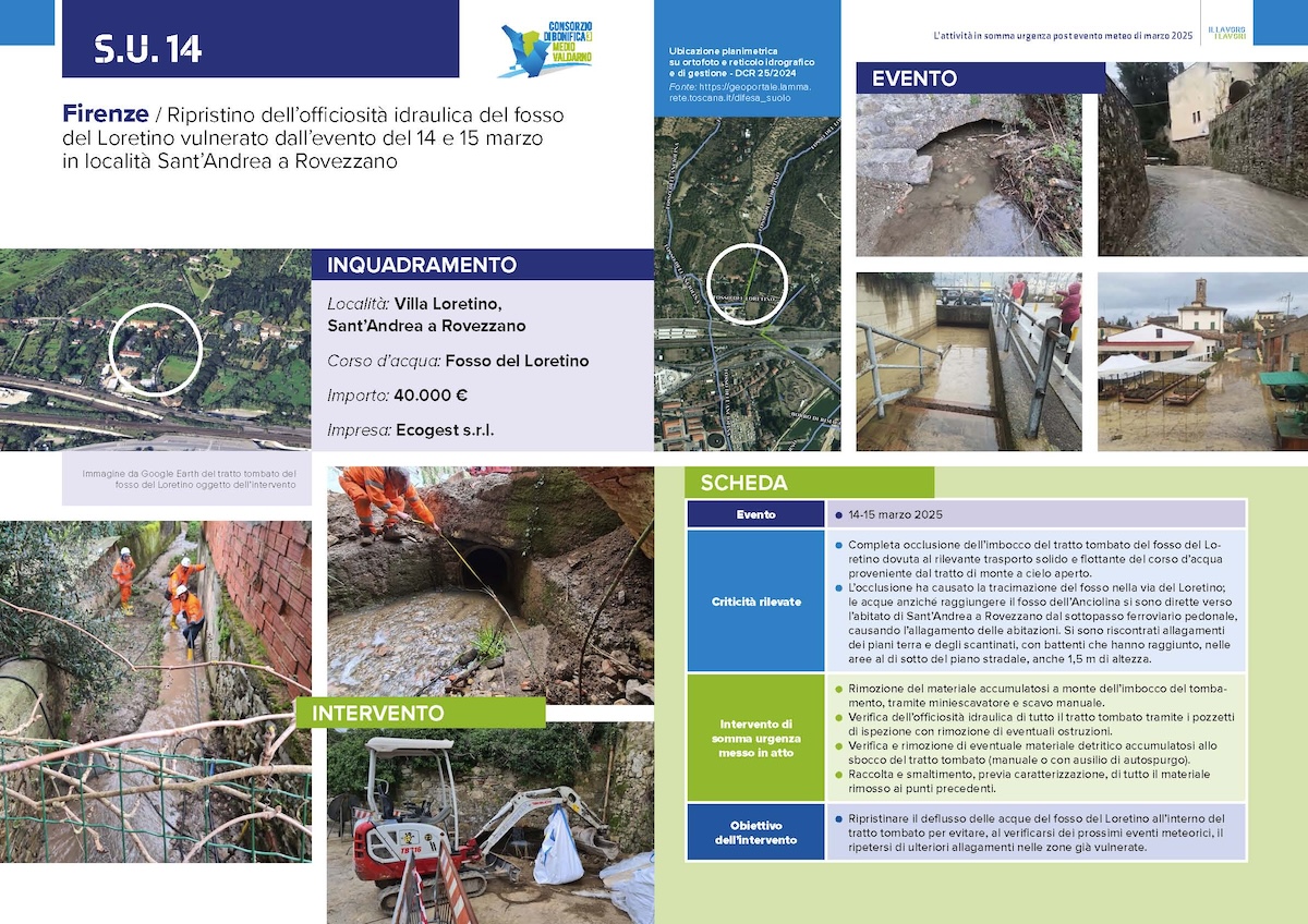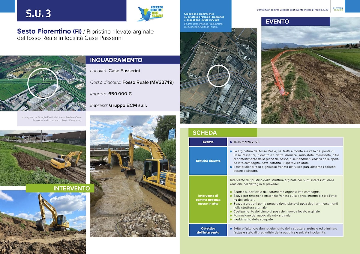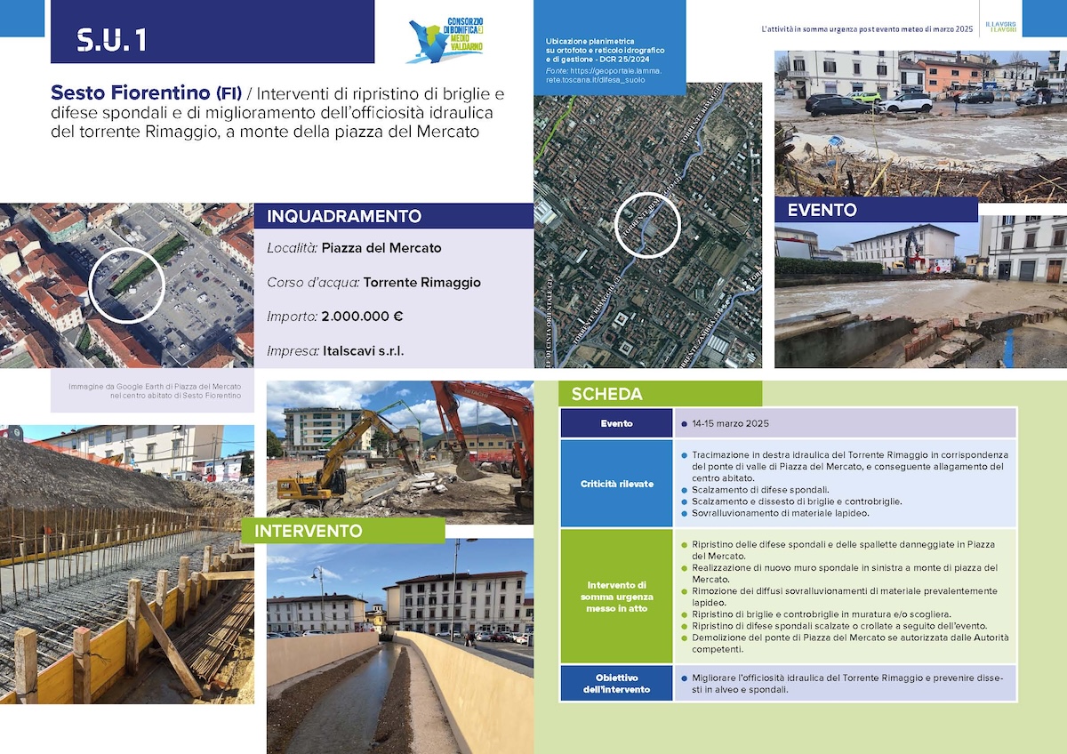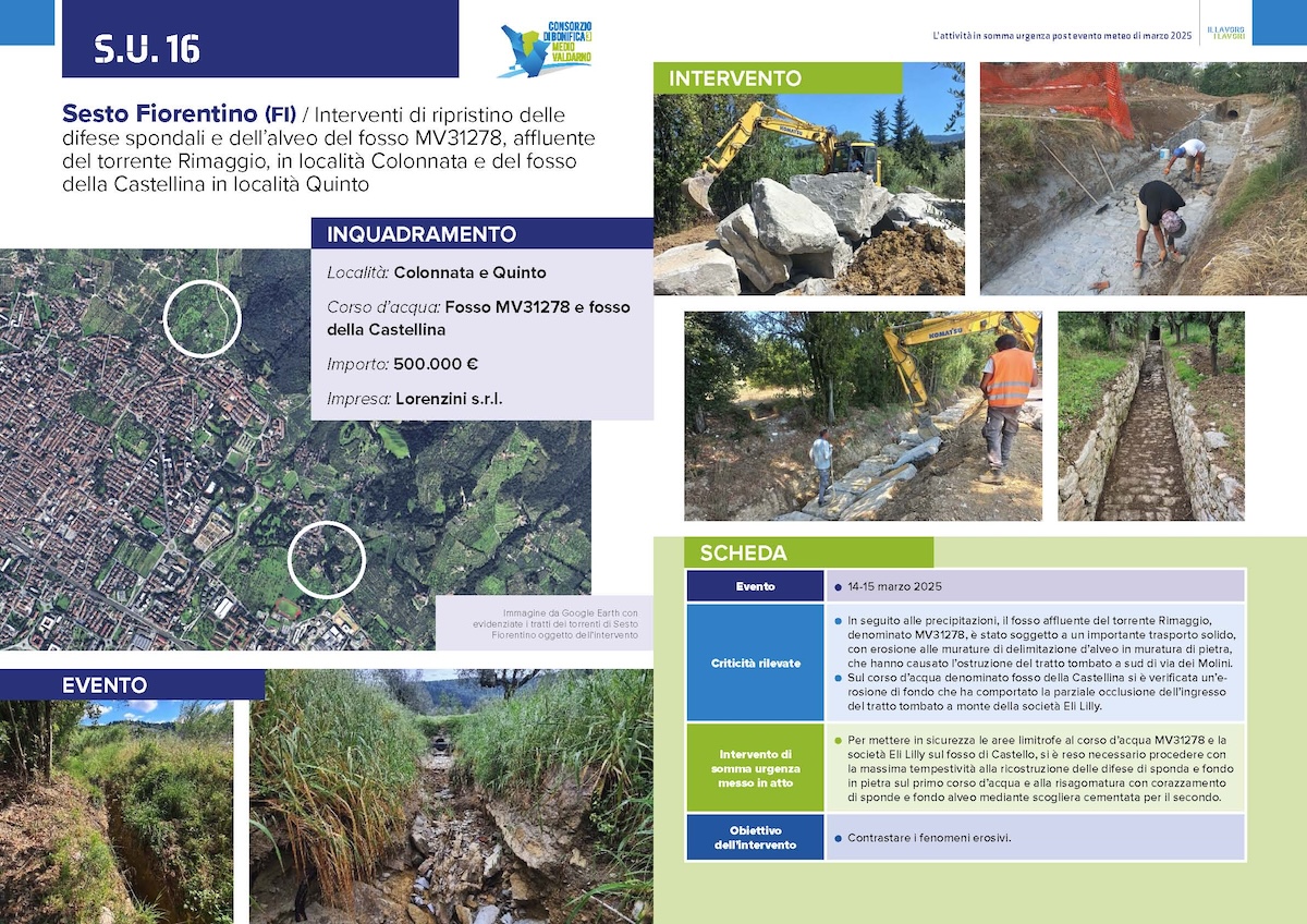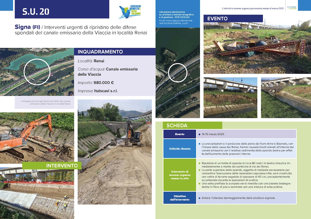 Nella sala Pegaso di Palazzo Strozzi Sacrati si è fatto il punto, in particolare, sui lavori di somma urgenza del Consorzio di Bonifica nel Comprensorio di Bonifica 3 Medio Valdarno: 20 interventi diffusi sul territorio per un valore complessivo di poco meno di 19 milioni che oltre a Sesto Fiorentino, con la demolizione del ponte di Piazza del Mercato ed il rifacimento delle spallette di contenimento, hanno interessato gran parte della Piana Fiorentina (Calenzano, Campi Bisenzio, Signa e Firenze), l'area Pistoiese (Agliana e Quarrata) ed Empoli fino ad arrivare anche ai confini regionali con l'intervento per la pulizia dai rifiuti del Torrente Rovigo a Palazzuolo sul Senio.