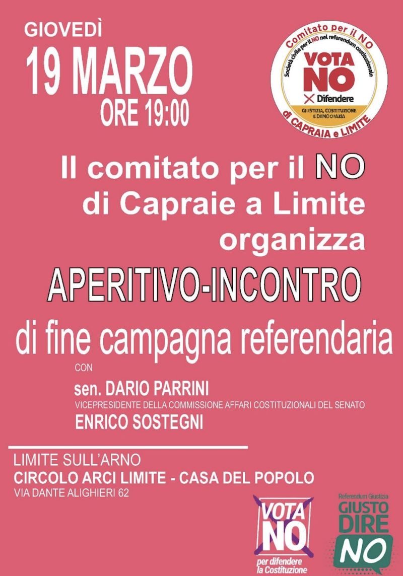 Il Comitato per il NO al referendum di Capraia e Limite conclude la Campagna referendaria il 19 marzo alle ore 19 con un "incontro-aperitivo" presso la Casa del Popolo di Limite in Via Dante, 62. "È stato oltre un mese di partecipati incontri che si sono svolti in tutti i Circoli ARCI del Comune, a cui hanno partecipato politici, magistrati ed Avvocati", che negli appuntamenti con la cittadinanza "hanno spiegato in maniera circostanziata ed approfondita tutti gli aspetti e le criticità della Riforma Costituzionale con cui vengono cambiati 7 Articoli della Costituzione e minato il principio fondamentale dell'autonomia della Magistratura rispetto al potere Esecutivo e Legislativo. Non sono mancate le risposte a falsificazioni e strumentalizzazioni che hanno cercato da parte dei sostenitori del SI di spostare la discussione sul terreno dell'efficienza della Giustizia che non viene minimamente affrontato dalla Riforma stessa, - proseguono dal Comitato - addebitando con attacchi talvolta oltre il limite della temerarietà alla Magistratura cui sono state attribuite responsabilità per azioni dipendenti esclusivamente da applicazioni di leggi e norme istituite, con provvedimenti anche recentissimi, dallo stesso governo in carica". Per il Comitato "molto chiaramente sono emersi i reali problemi dovuti alla mancanza di risorse umane ed economiche inerenti al tema della Giustizia, che richiederebbe provvedimenti concreti senza ricorrere a forzature della nostra Costituzione che più che modificata andrebbe applicata".
