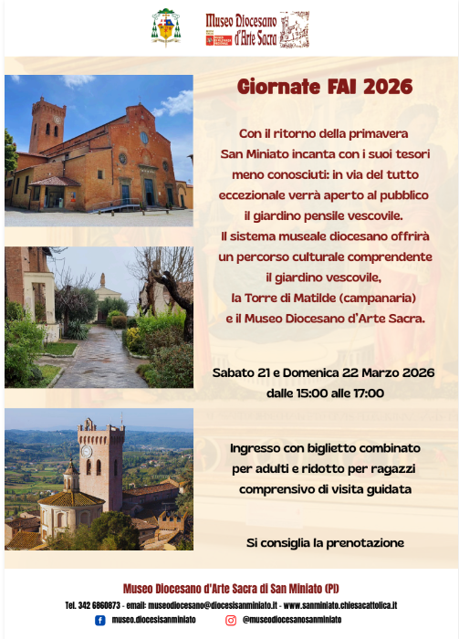 Con il ritorno della primavera Sabato 21 e domenica 22 marzo 2026 tornano, per la 34ª edizione, le “Giornate FAI di Primavera”, il grande evento di piazza attraverso il quale, dal 1993, il FAI dà la possibilità di riscoprire il patrimonio culturale e paesaggistico delle città e dei territori in cui si vive. In tale occasione saranno visitabili centinaia di luoghi, spesso poco conosciuti e valorizzati, molti dei quali solitamente inaccessibili.  Proprio seguendo tale criterio, il Museo Diocesano d’Arte Sacra di San Miniato (Pi) proporrà la straordinaria apertura del giardino vescovile. Questo, ricavato sulla sommità di un muro di contenimento, rientra nella categoria dei giardini pensili all’italiana; essi risultano caratterizzati da un compromesso architettonico che bilancia la rigidità geometrica del Rinascimento con le necessità di spazio in contesti urbani ristretti, creando terrazze verdi strutturate. Inoltre, sviluppando il suo affaccio sulla Piazza della Repubblica, sede del Seminario Vescovile, offre uno scorcio panoramico unico. Vi aspettiamo numerosi!