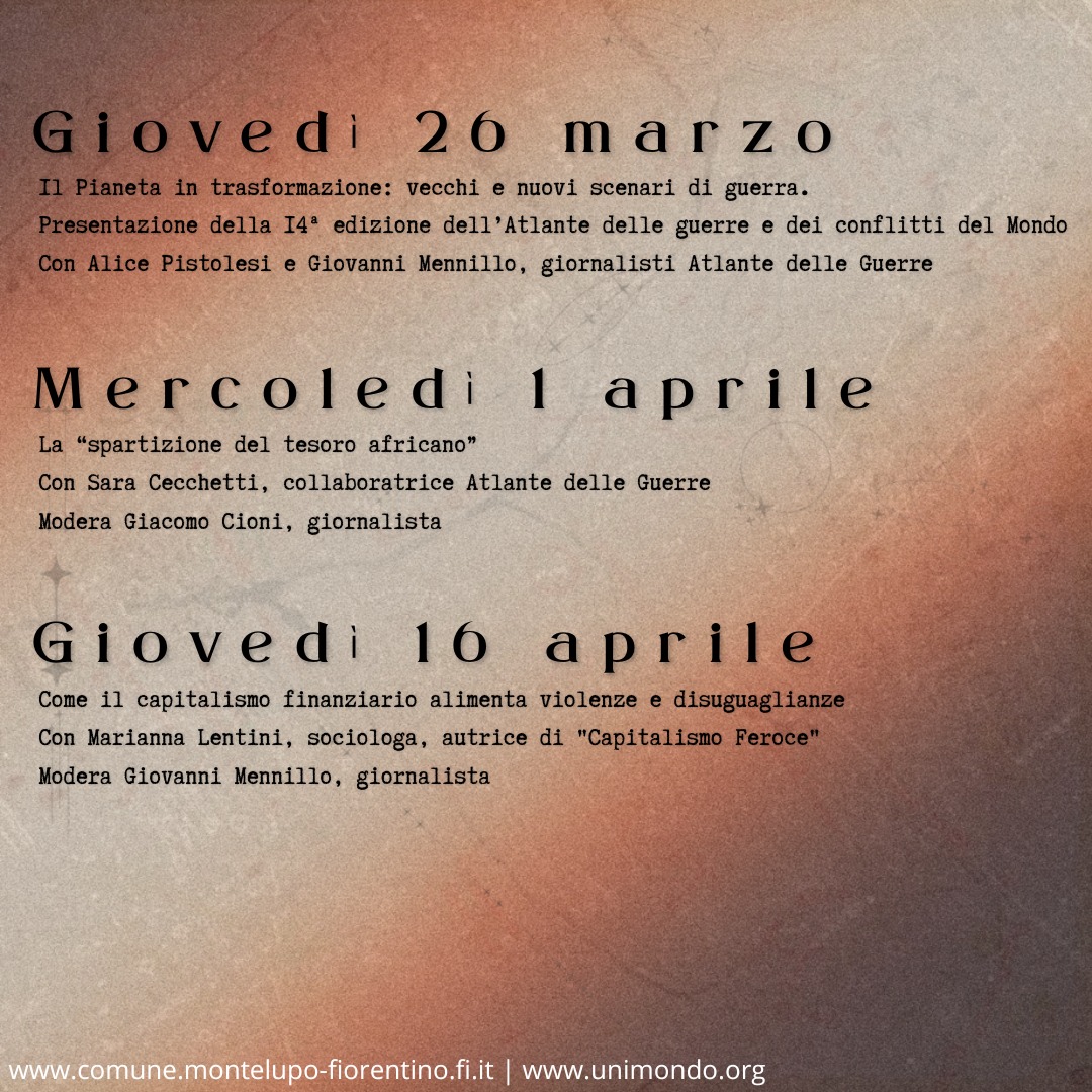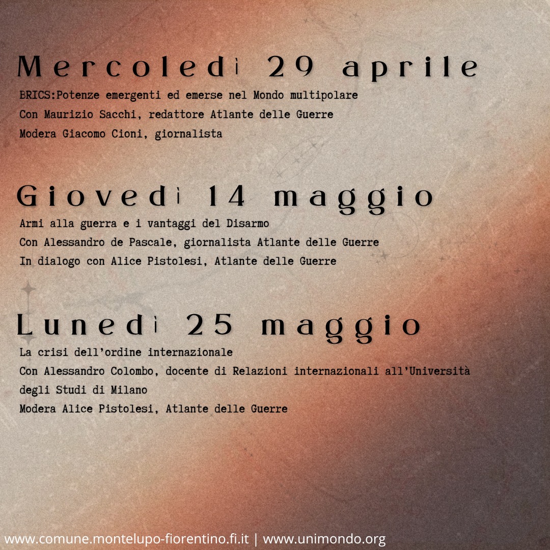 Il ciclo di sei incontri, realizzato dal Comune di Montelupo Fiorentino insieme alla redazione dell’Atlante delle guerre e dei conflitti del Mondo, ha l’obiettivo di discutere e tentare di comprendere le trasformazioni del mondo contemporaneo.