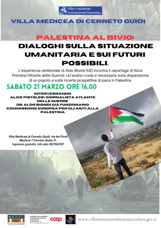'Palestina al bivio: dialoghi sulla situazione umanitaria e sui futuri possibili' è il titolo della conferenza stampa che si terrà sabato 21 marzo alle ore 16 presso la Villa Medicea di Cerreto Guidi. Interverranno la giornalista dell'Atlante delle Guerre e dei Conflitti del Mondo Alice Pistolesi e il Dr. Aldo Biondi, ex funzionario della Commissione Europea per gli aiuti alla Palestina.