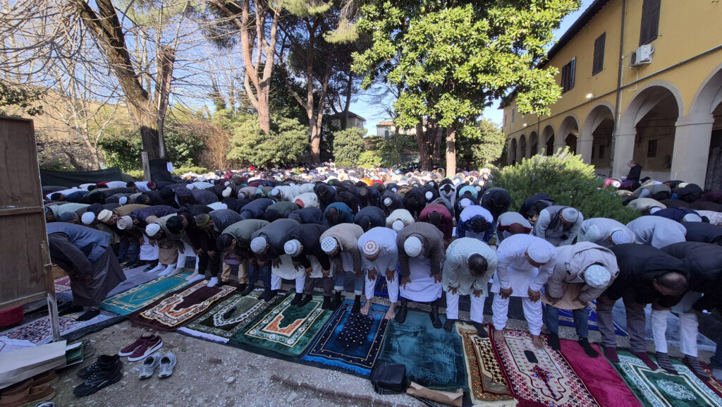 Circa cinquecento fedeli musulmani si sono riuniti a Prato per celebrare la fine del Ramadan nel piazzale interno del complesso di San Domenico, spazio concesso anche quest’anno dalla diocesi. La preghiera, promossa dal Centro islamico bengalese, si è svolta nella mattinata del 20 marzo in un’area non destinata al culto, solitamente utilizzata come parcheggio e dotata di ingresso separato rispetto alla chiesa e al chiostro, rimasti aperti ai fedeli.