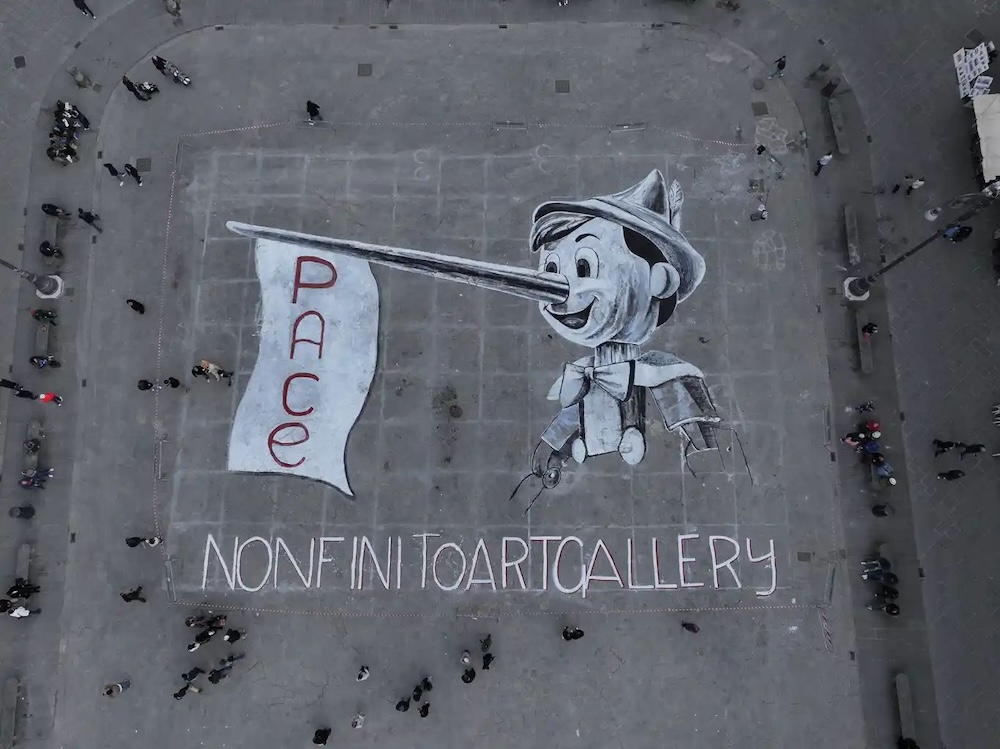 C’è un bambino di legno che non ha mai smesso di correre tra i vicoli di Firenze e oggi ha deciso di fermarsi nel suo salotto più bello. Piazza Santa Croce, nella Settimana del Fiorentino, si è trasformata in un soffice tappeto di sogni e colori per accogliere "Il Grande Pinocchio". Per celebrare i 200 anni dalla nascita di Carlo Collodi, il selciato storico della piazza è diventato una tela a cielo aperto, dove il profilo del burattino più amato del mondo ha preso forma come per magia. Per portare un messaggio chiaro: "Pace".